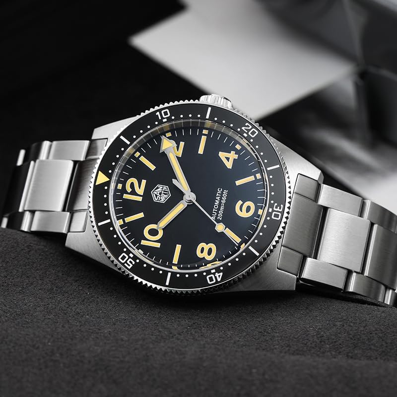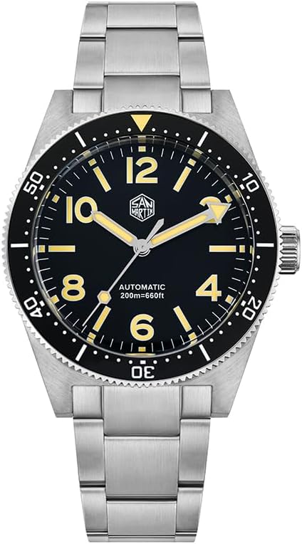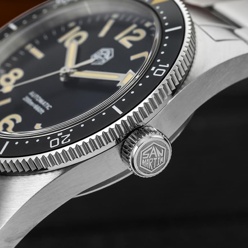 20 Bar Water Resistant: With a water resistance of up to 200 meters, the San Martin SN0139 Automatic Men's Watch is a true diving watch. The screw-down crown for a watertight seal and uni-directional ceramic bezel to tell you under time easily. Suitable for professional marine activities, swimming, water sports, and daily wearing