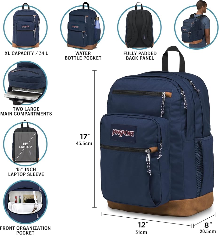 Always be ready for any everyday adventure with the JanSport Laptop Backpack! Available in multiple colors, prints and patterns, this backpack will let anyone show off their style, while keeping them organized with plenty of space. These bags are made with high-quality, reliable materials, and feature a synthetic leather bottom and trim details for extra style you're sure to love!With a simple, convenient design, this backpack is designed for the ultimate in functionality! Each women's and men's laptop backpack features 2 large main compartments to hold your books and other essentials, and a dedicated padded 15-inch laptop sleeve to keep your computer secure. Plus, these bags include a side water bottle pocket, a pleated front stash pocket with an organizer, cord pullers and a web haul handle. Designed to be sturdy and comfortable, our bag has ergonomic S-curve shoulder straps and a fully padded back panel so you can always carry any load. At JanSport, we have been engineering high-quality, durable and reliable products since 1967, and we stand behind our large bags. This backpack with a laptop compartment has been carefully designed to provide unmatched functionality, convenience and utility. Always be ready for any everyday adventure with our laptop backpack!Product Details:(1) Cool Backpack Materials: 600 Denier Polyester, Synthetic LeatherSize: 17 x 12 x 8 inchesCapacity: 34 L
