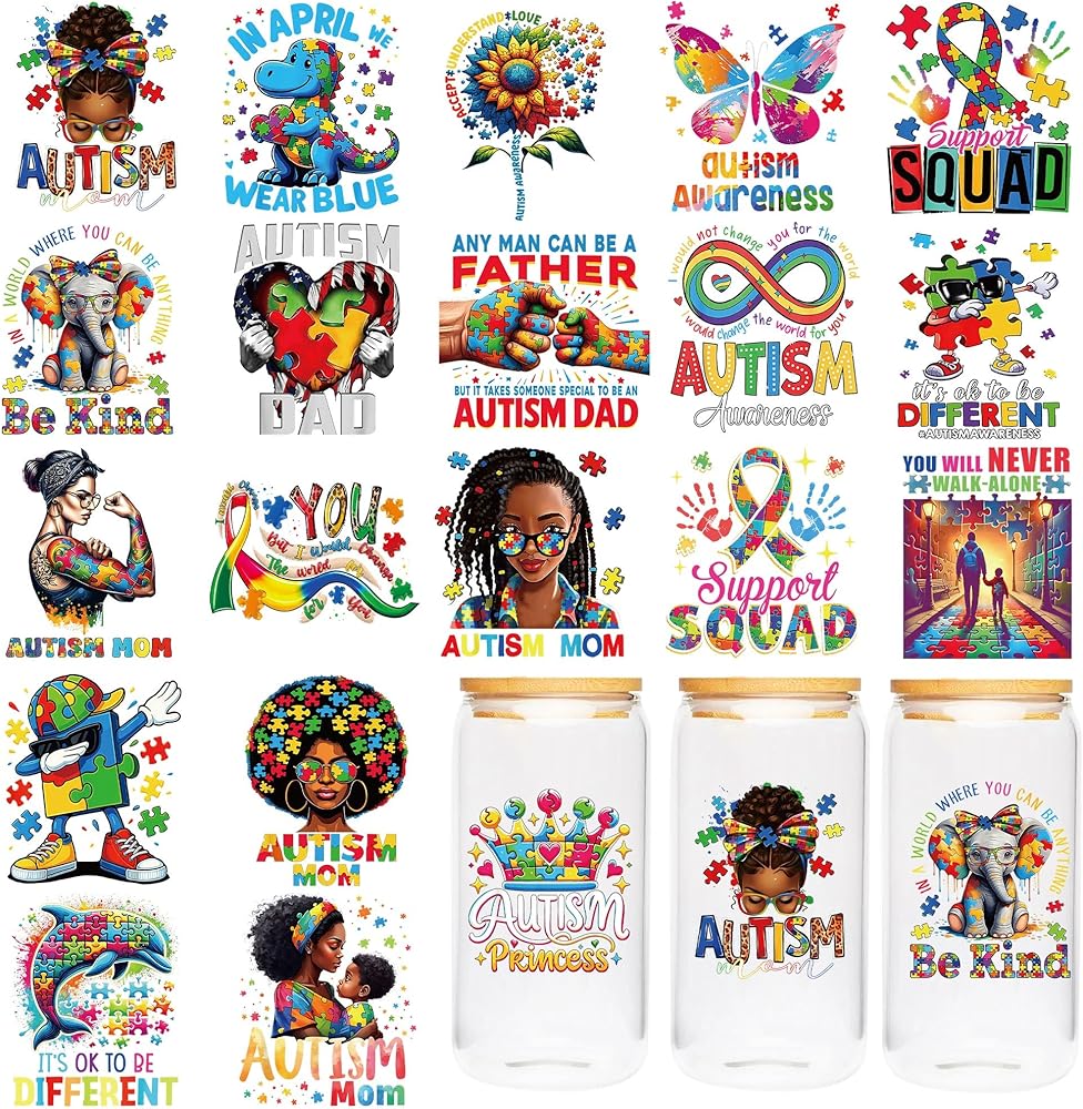 UV DTF Transfers Sticker - 20 Sheet Autism Awareness UV DTF Cup Wrap, Colorful Support Wraps for Glass, DIY Crafts for Special Education Teachers Parents