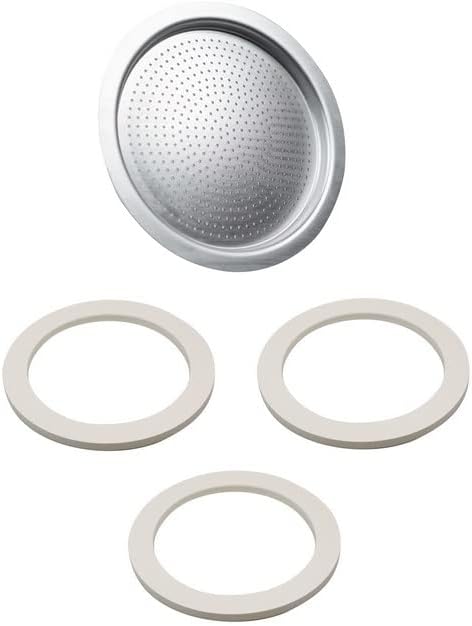 Univen stovetop espresso filter and gasket seals compatible with Bialetti 3 cup aluminum espresso makers such as Moka Express, Moka Timer, Moka Melody Sport, Dama, Fiammetta, Break and Alpina. Includes one filter plate and three gasket seals. Gaskets are made in USA of non-toxic, food safe EPDM rubber. Filter plate is 2.25" (57mm) in diameter. Gaskets inside diameter 2" (51mm), outside diameter 2.59" (66mm).