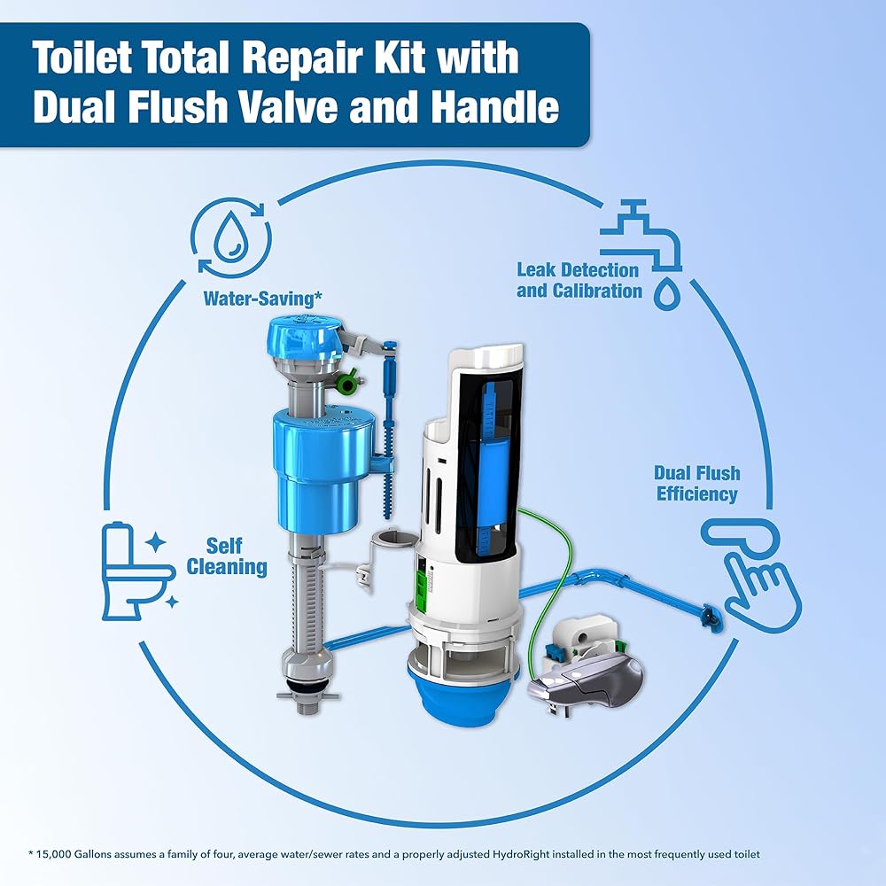 The Danco HYR451T HydroRight Total Repair Kit increases your toilet's efficiency with an included Dual Flush Converter that will save water by reducing the amount of water used with each flush. The HydroRight will also help solve the most common leaking issue in toilets, a non-functioning flapper. The Dual Flush Converter sits vertically and solidly onto the flush valve opening to create a better seal and eliminate the possibility of leaks. No more leaky flapper, tangled chains or handles that have to be jiggled. The Total Repair Dual Flush Valve quickly and easily converts a standard toilet into a two-handle, dual flush toilet. The short center lever is the Quick Flush setting that uses significantly lower water volumes for liquids and paper - the setting needed 4 out of 5 times. The second complete push lever at end is the Full Flush that uses the normal amount of water for solids. Designed for drop-in installation, the HYR451T can be installed in without tools and without having to remove the tank.