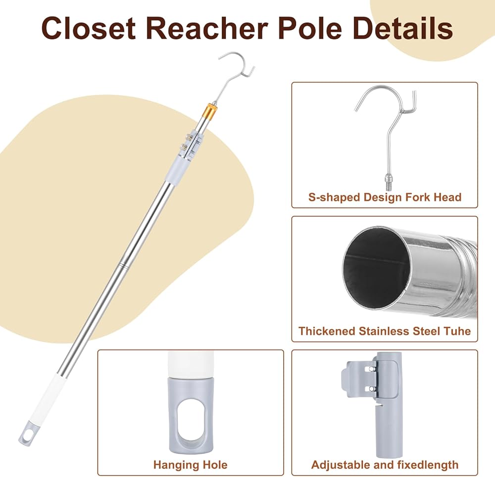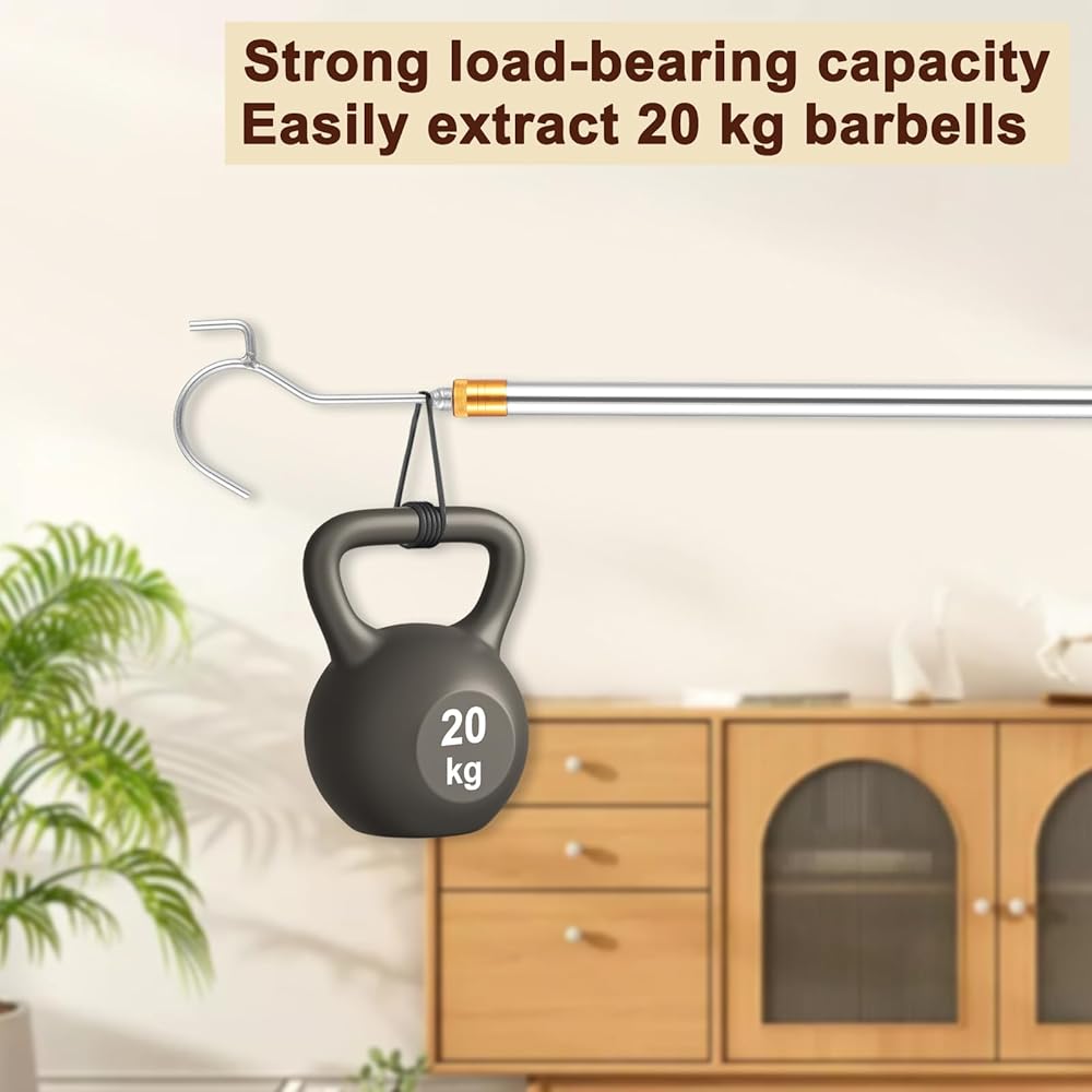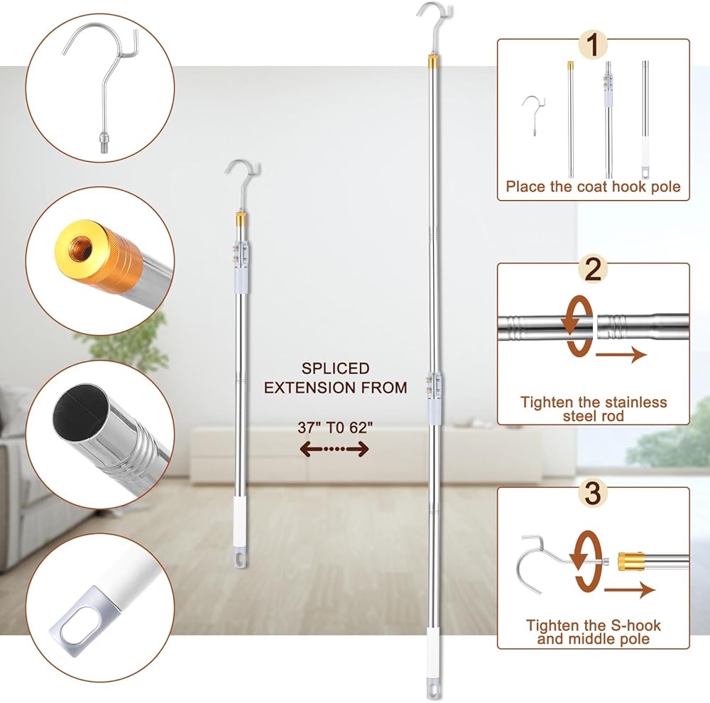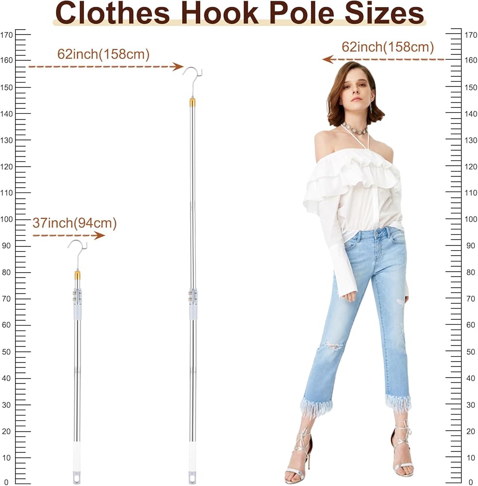 【Scalable】: Our clothes hook pole comes with a 37 inch to 62 inch scalable docking bar, allowing you to effortlessly reach tall shelves, Christmas light poles, clothes, and even open windows.
