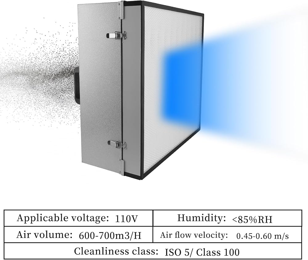 HEPA FILTER: Continuously filters fresh air through laminar flow. Creates a dust-free working environment. Filters 99.99% of airborne particles greater than or less than 0.3 microns in diameter. Class 100 cleanliness. Filtration efficiency meets ISO Class 5 cleanliness standards.