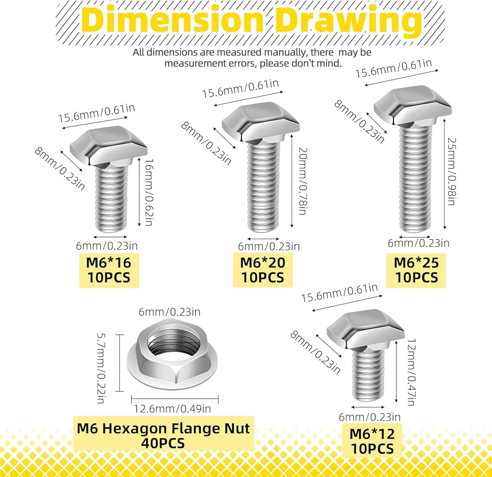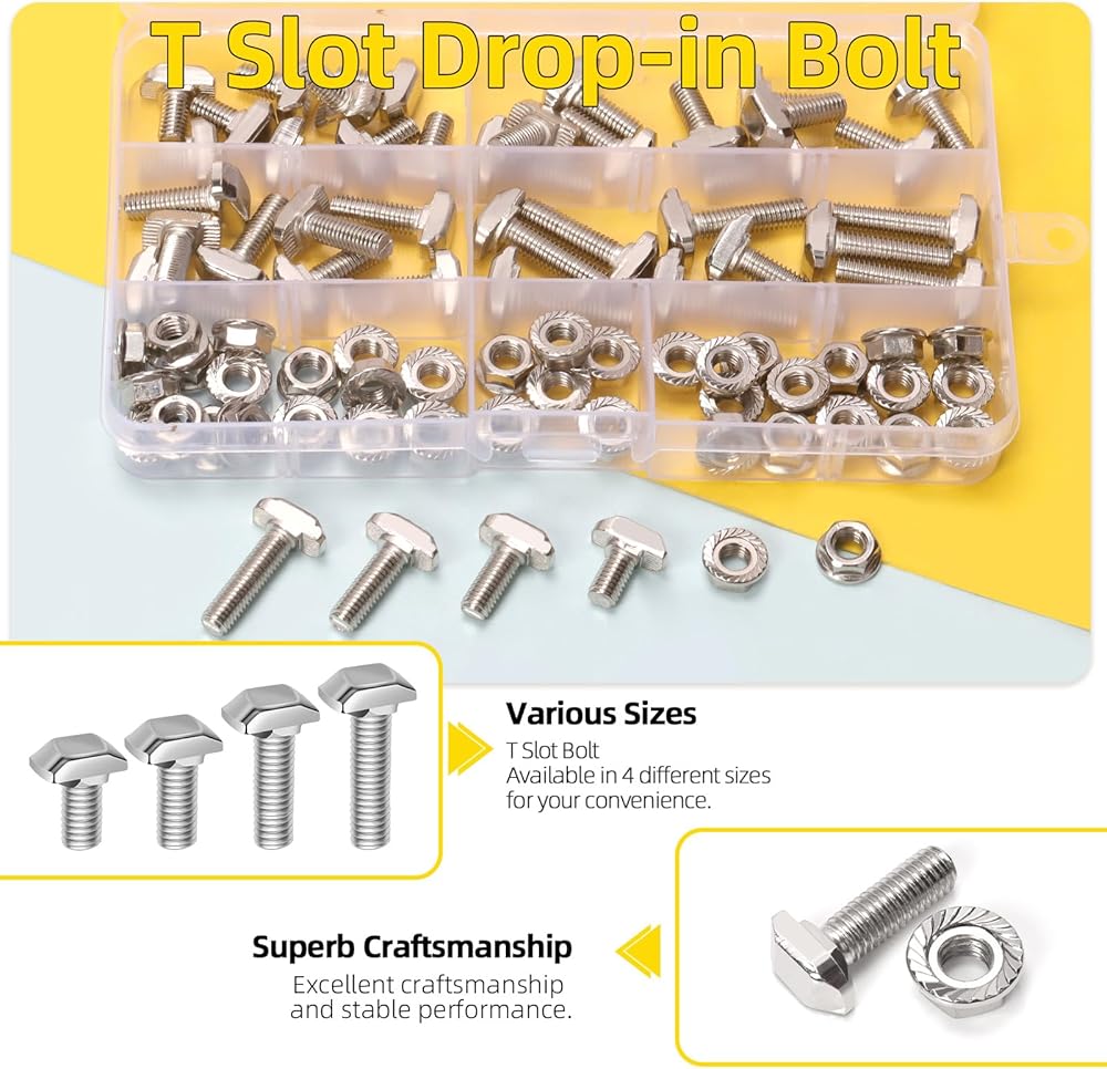 WHAT YOU WILL GET: You'll receive 60 sets M8 T slot drop in bolt kit, including 10pcs M8x16mm T-slot bolts, 10pcs M8x20mm T-slot bolts, 10pcs M8x25mm T-slot bolts, 10pcs M8x30mm T-slot bolts, 10pcs M8x35mm T-slot bolts, 10pcs M8x40mm T-slot bolts and 60pcs M8 flange nuts, all items are packed in a plastic box for easy storage and carrying.
