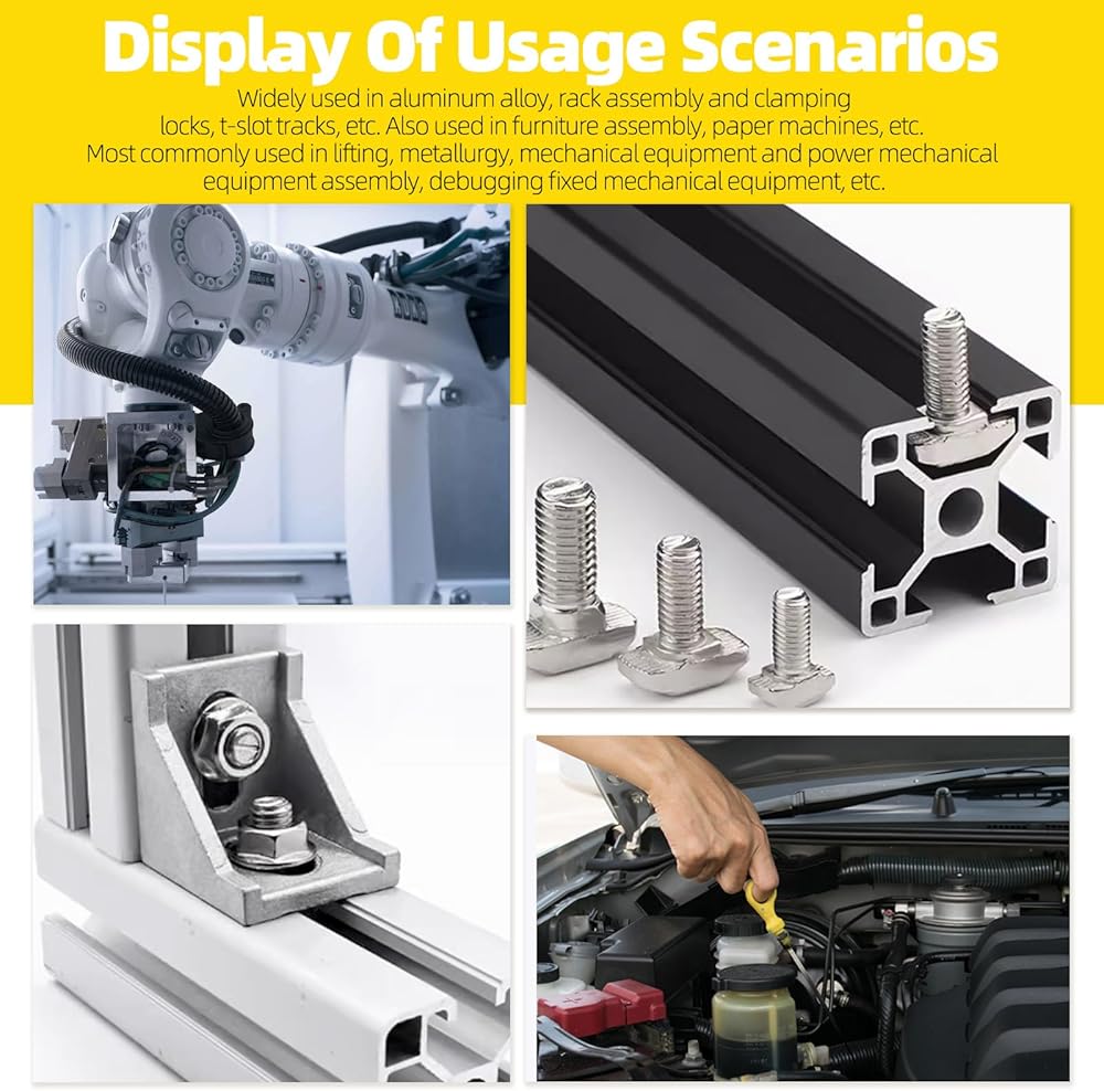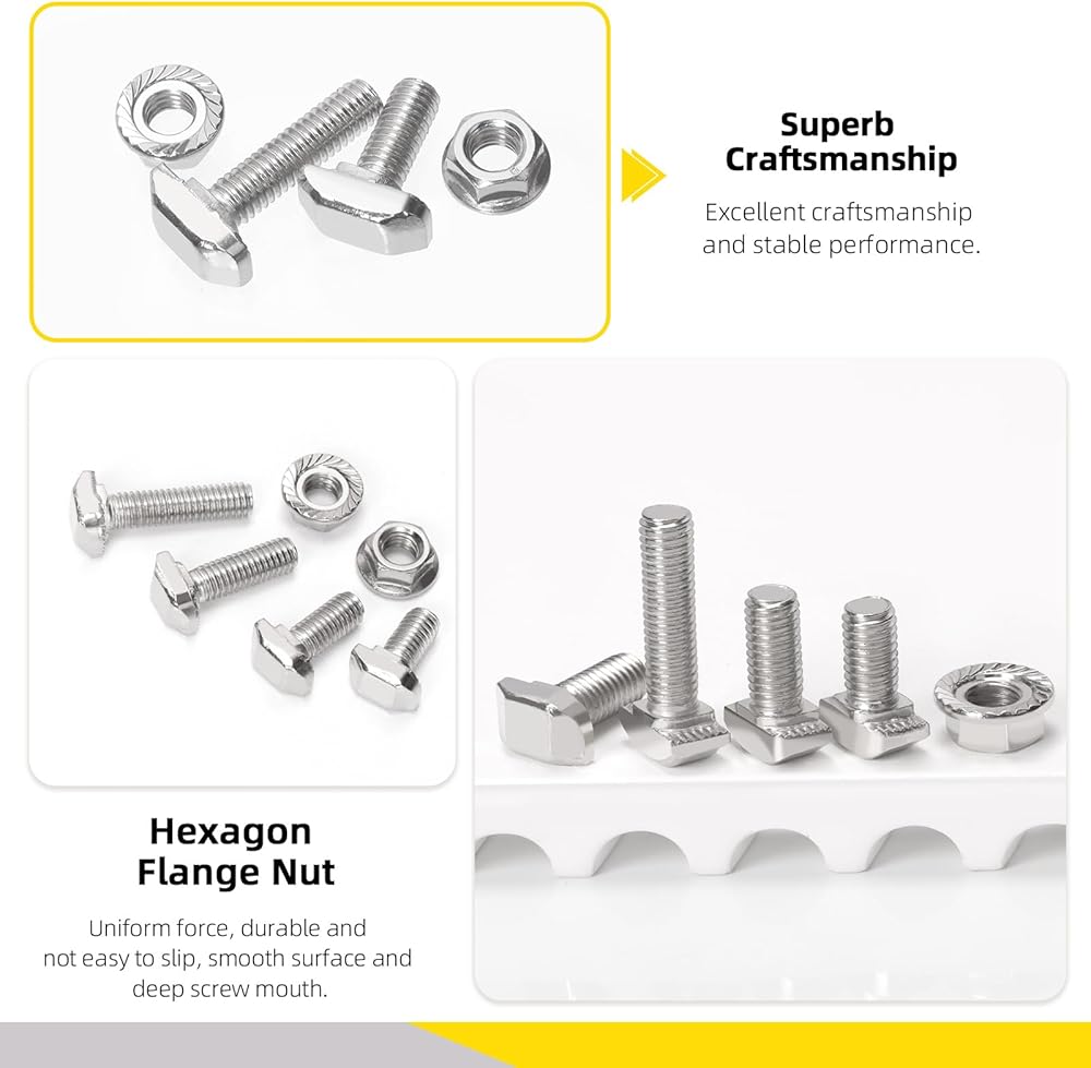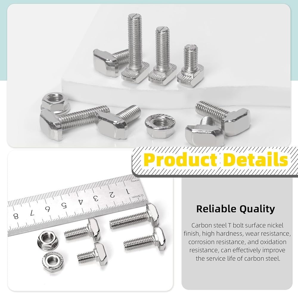 QUALITY MATERIAL: The T shape stud sliding screws and flange nuts are made of quality carbon steel with nickel-plated finish for high hardness, wear resistance, corrosion resistance and oxidation resistance, which can be used for long-term.