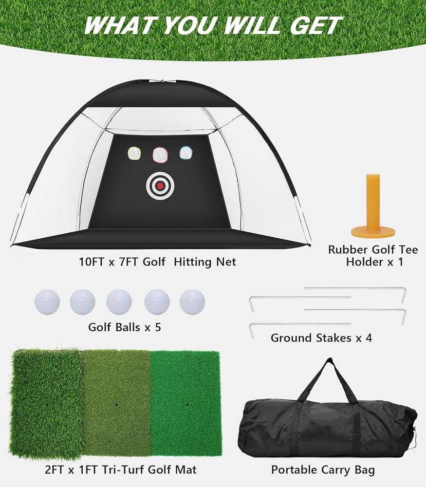 Golf Net, 10x7ft Golf Practice Net with Tri-Turf Golf Mat, All in 1 Home Golf Hitting Aid Nets for Backyard Driving Chipping Swing Training with Target/Mat/Balls/Tee/Bag - Gift for Men/Golf Lovers