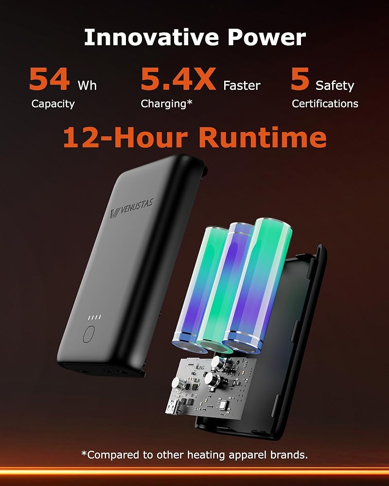 2 HRS Fast-Charging Battery Pack: Venustas fleece heated vest comes with a 35W fast charging power bank that can be fully charged in 2h. The multifuntional power bank can not only be used for Venustas 7.4V and 12V heated apparel but also charge your phone or other smart devices, making it convenient in outdoor lifestyle.