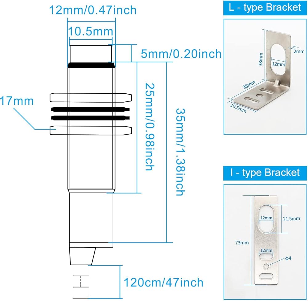 • Package Content: 2 pcs NPN NO 4mm inductive proximity switch; 2 pcs I-type bracket; 2 pcs L-type bracket.