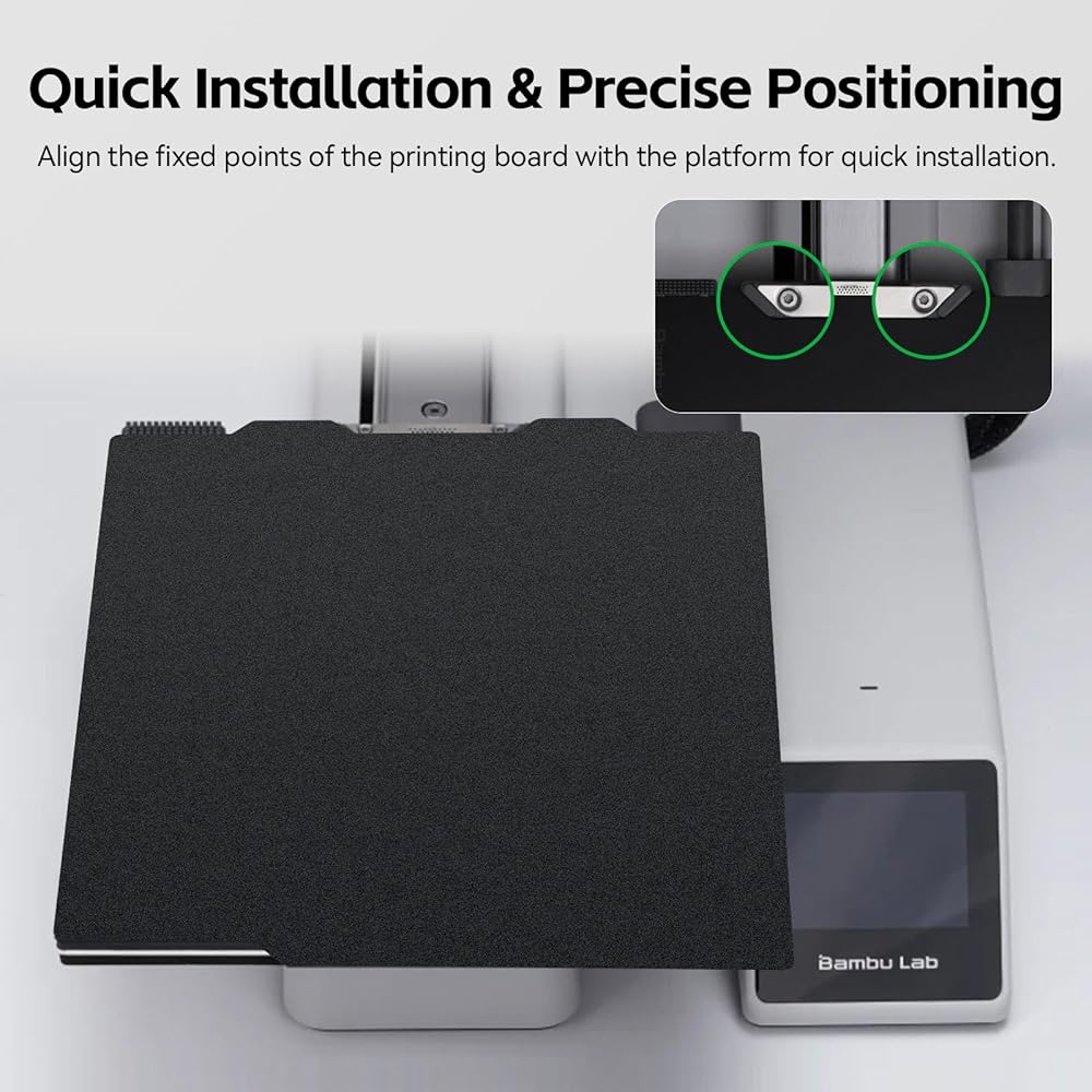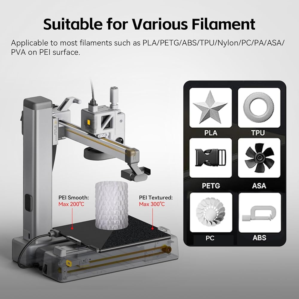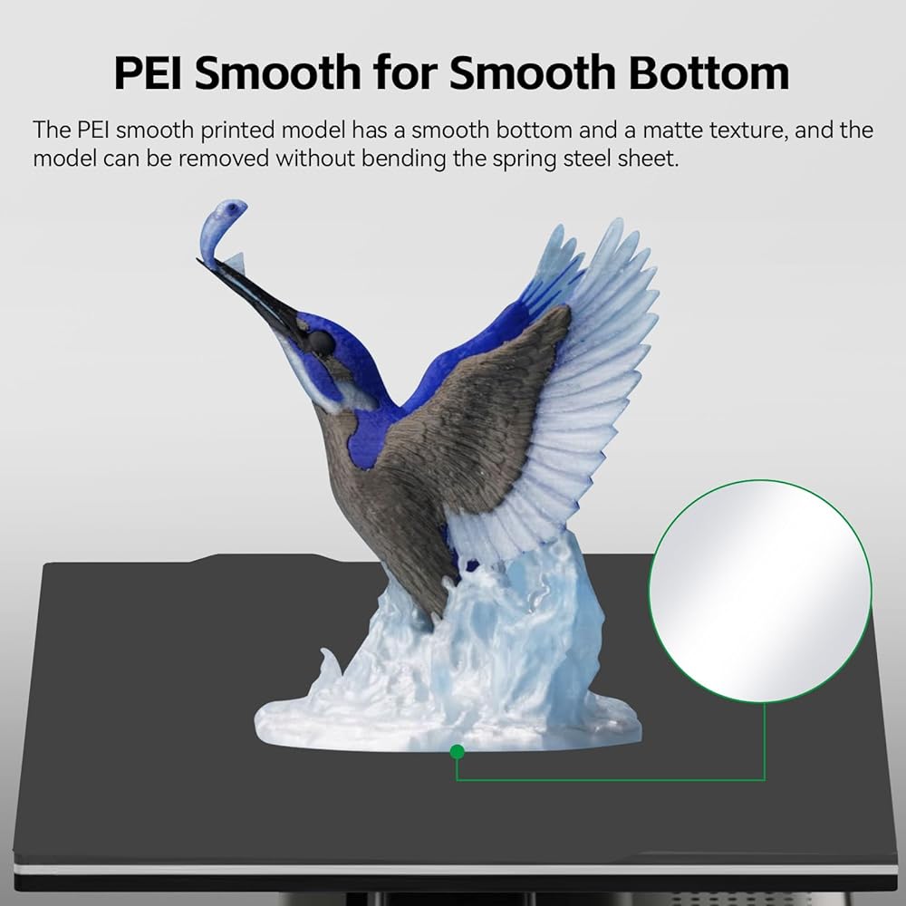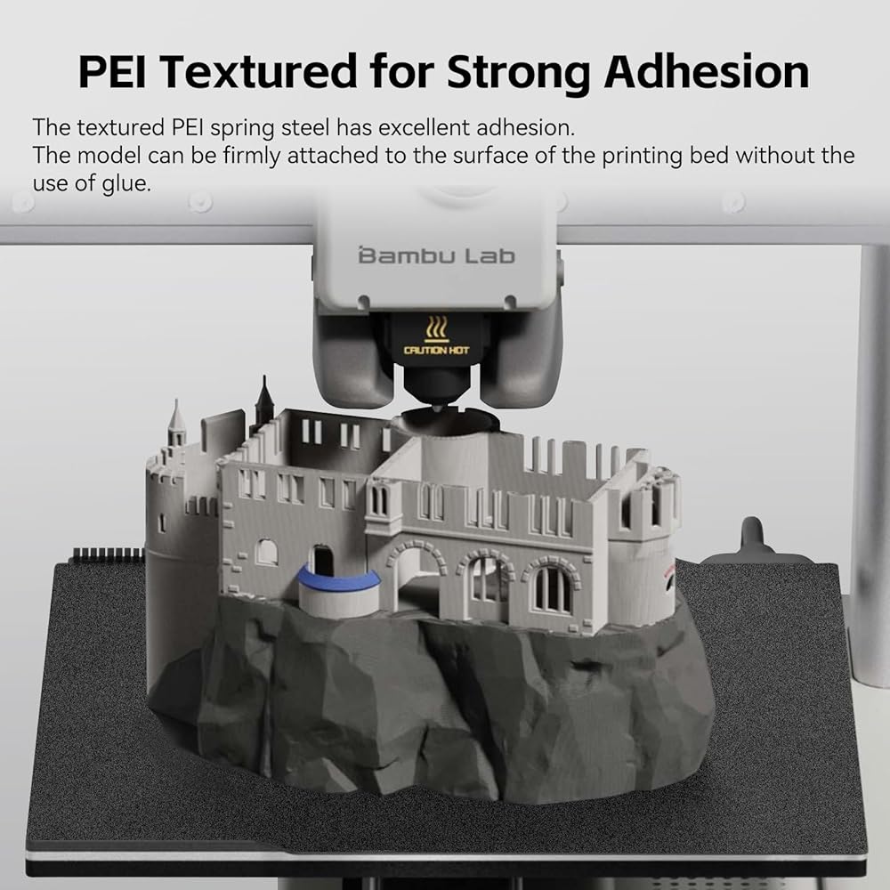 ⭐Strong Adhesion:The black textured PEl has high adhesion to prevent the model from warping while printing whether at high or low temperatures.