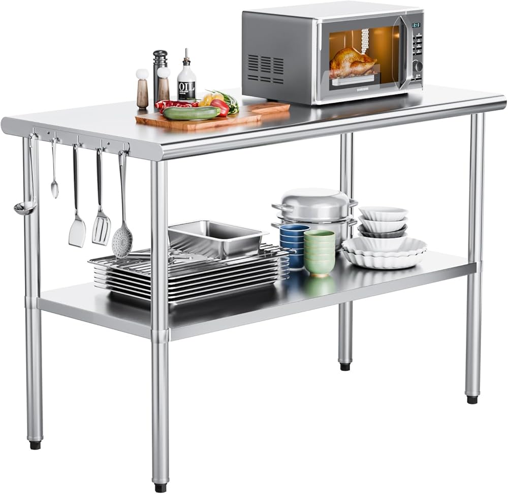 ➤【Large Storage Space】The 48" X 24" stainless steel folding table has super load capacity . You can place the kitchen utensils or any other tools in the top shelf, Without the lower shelf,allows you to put storage boxes, stools, clothes baskets and other equipment and supplies.