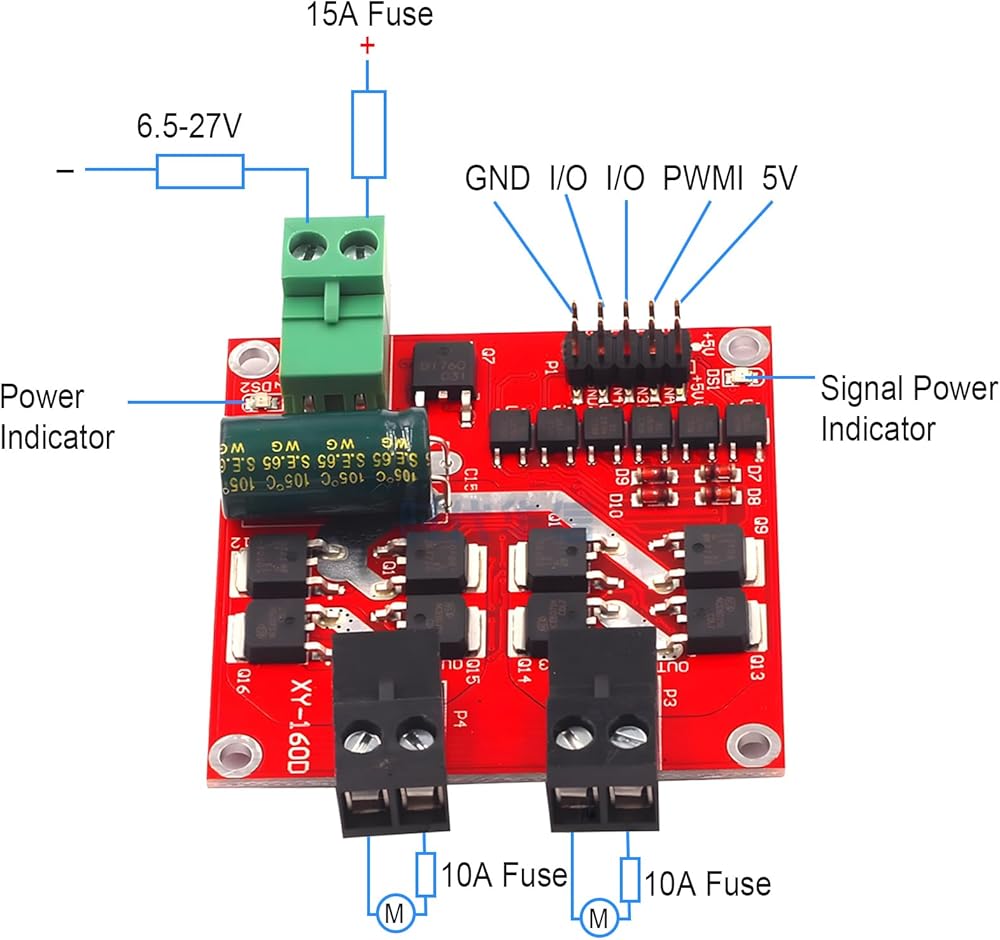 Dual-channel motor interface, each rated output current 7A, peak current 50A, the motor interface cannot be short-circuited, it is recommended to connect a 10A fuse in series.
