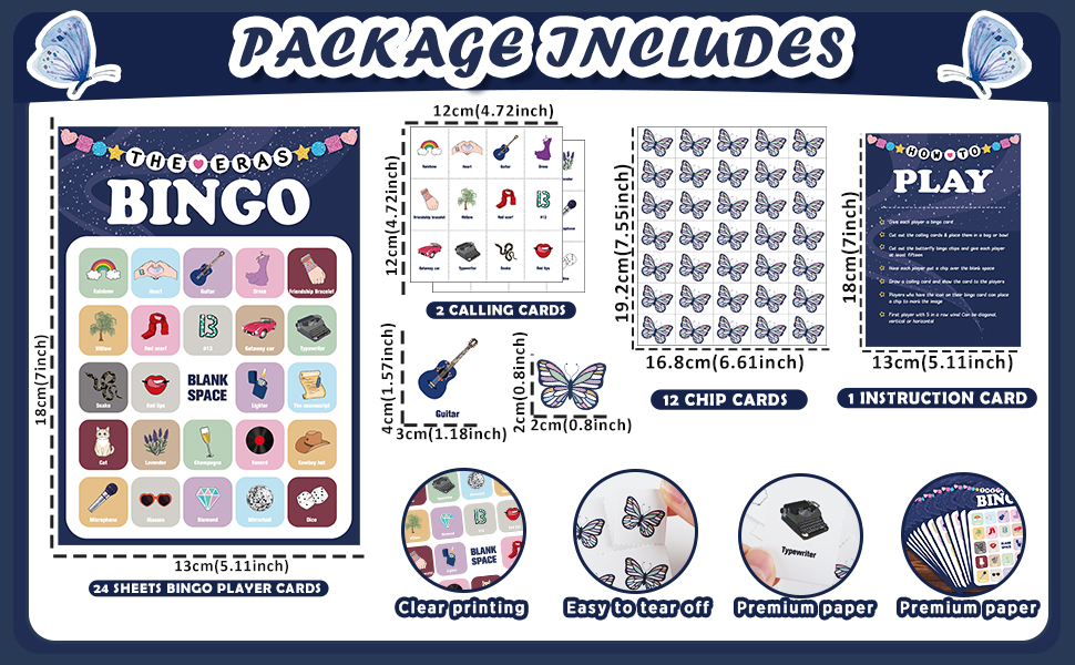 Package includes: You will get 24 sheets of Bingo Player Cards(7.1 x 5.1inches), 420pcs of Butterfly Bingo Card Chips, 2 sheets of call-out cards, and 1 sheet of instructions on how to play. This set offers ample cards for hosting a small family get-together or a larger party with friends, making it an essential addition to your entertainment. Ideal for family reunions, birthday parties, or community events, these cards ensure everyone can participate in the Bingo fun.