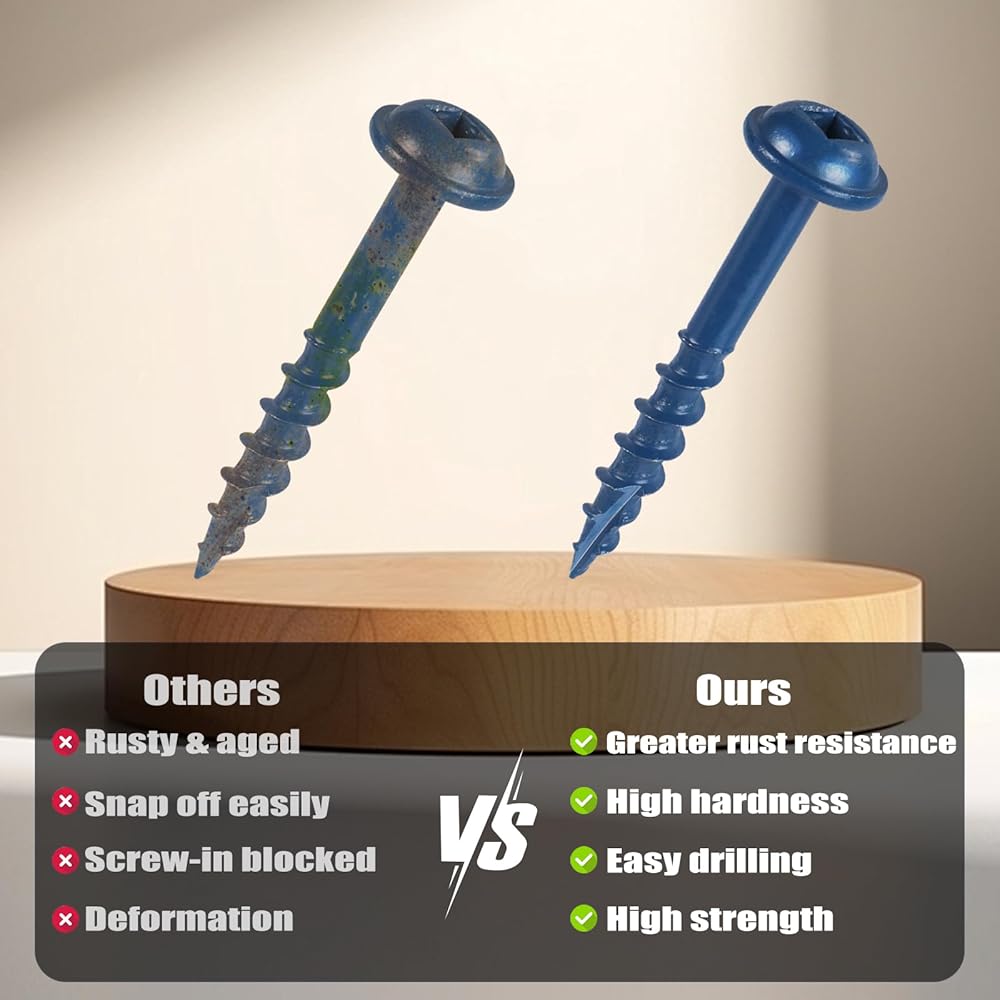 Anti-Rust Blue Coating: Our pocket hole screws are finished with 3-layer anti-rust blue coating, with high corrosion resistance, good for exterior & interior projects, pass 2500h salt spray test