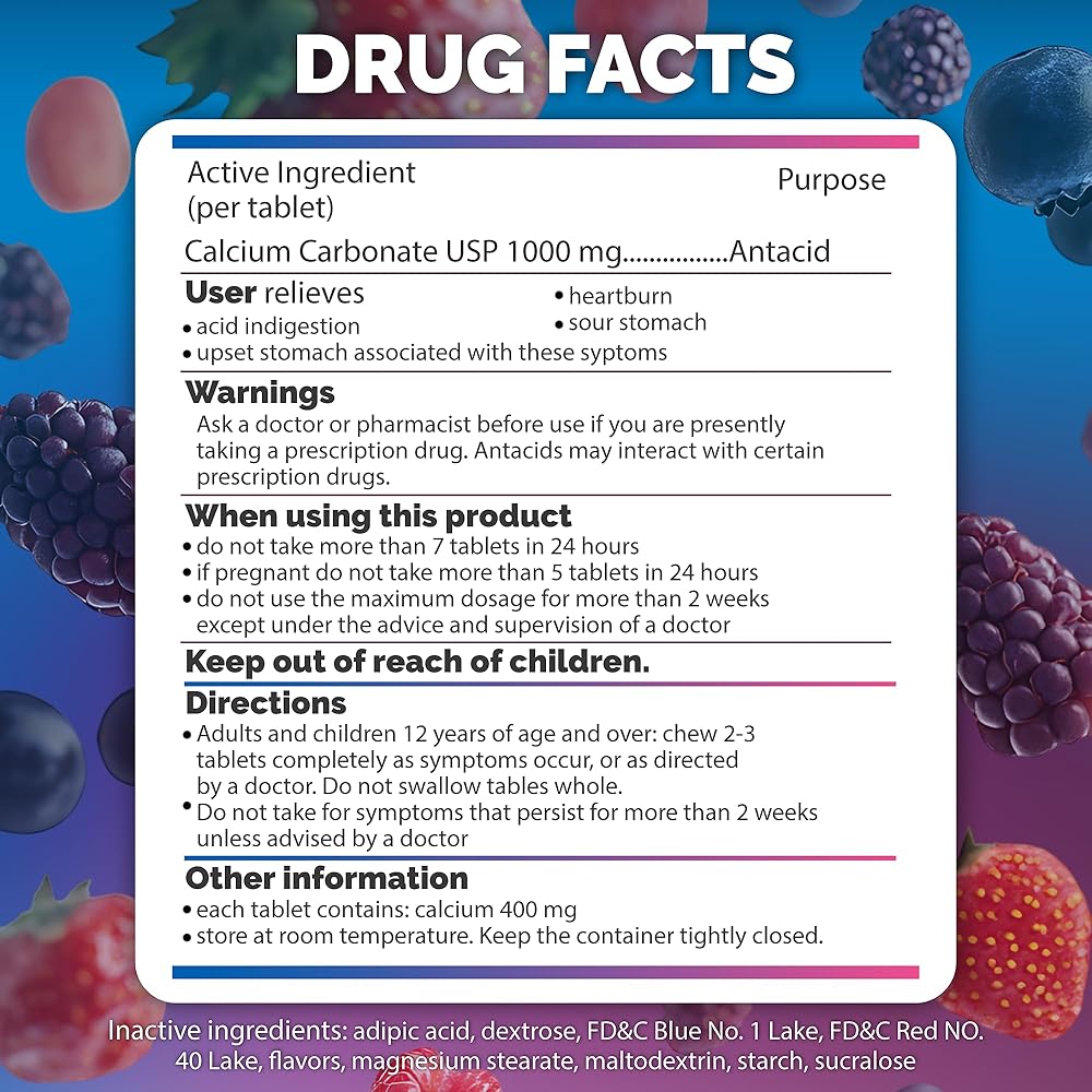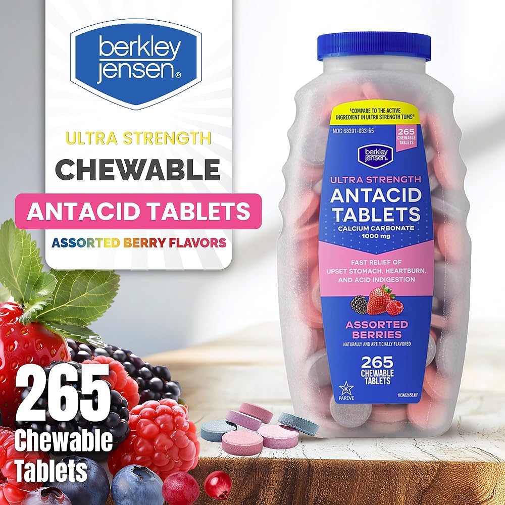 WHEN HEARTBURN STRIKES! Do you often find yourself suffering from heartburn or indigestion after a hearty meal? Does the discomfort hit you unexpectedly, disrupting your day? When these issues arise, you need a quick solution. berkley jensen Extra Strength antacid chewable tablets are your perfect companion, offering fast-acting and effective relief. EXTRA STRENGTH ANTACID TABLETS Our antacid gummies are specially formulated to soothe stomach, bringing you comfort at best. With 750mg of Calcium Carbonate USP per tablet, our antacid soft chews ease discomfort from heartburn, acid indigestion, and sour stomach effectively. Incorporating our heartburn tablets into your routine ensures that relief is always within reach, allowing you to enjoy food without worry. WHY CHOOSE US? Our anti acid relief chewable tablets are designed for rapid relief, and each tablet is powerful yet gentle on your stomach. Plus, gluten-free, and dairy-free formula makes it suitable for everyone, including those with dietary sensitivities. Extra Strength Relief: Each chewable antacids extra strength contains Calcium Carbonate that neutralizes stomach acid effectively. Delicious Berry Flavor: Natural and artificial berry flavors make our heartburn chews a treat to take, with an easy-to-chew texture. Convenient Pack Size: With 200 antacid chews per bottle, you'll always have ample supply for relief at home, work, or on the go. High-Quality Manufacturing: Produced in a facility with strict quality protocols to ensure the best chewable antacids for you and your family. HAVE QUESTIONS? We're here to help! If you have need further assistance, please don't hesitate to contact us.