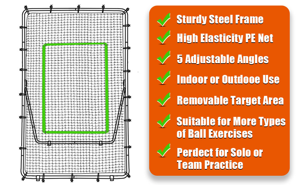 PREMIUM QUALITY METAL FRAME: This baseball/volleyball rebound frame is made of high quality steel construction, sturdy and durabel, with powder coated surface material for better corrosion resistance and rust prevention, thickened iron pipe design can withstand harsh environmental climate and also more durabel. With 4 metal ground stakes to provide extra stability