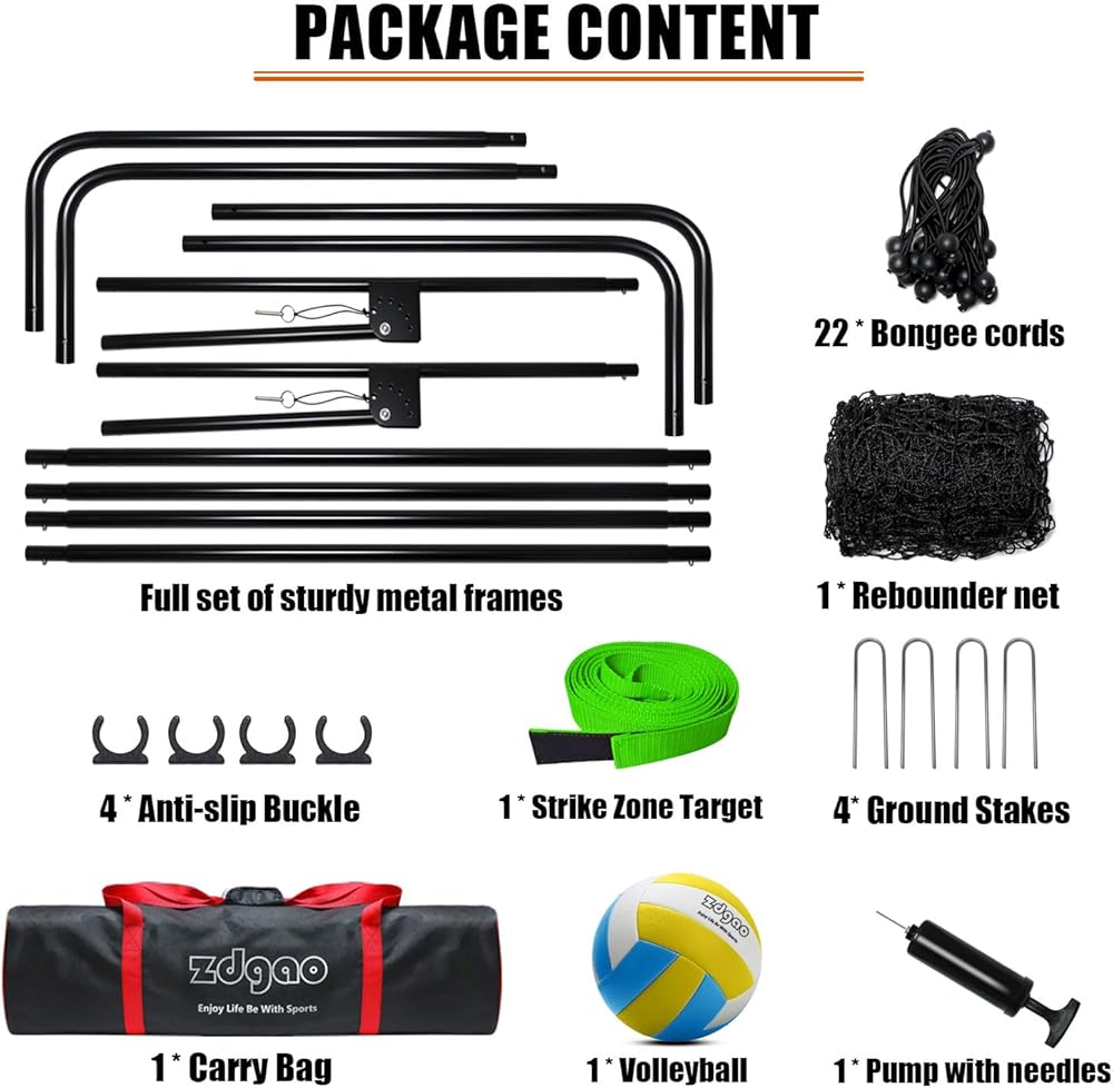 YOU WILL RECEIVE: A full metal frame, 1 x 1.25 inch stretch net with high strength elasticity for durability, 22 x loads of elastic cord for attachment, 1 x detachable strike zone target, 1 x volleyball ball with pump for batting practice, 4 x ground stakes for stability, and 1 x portable carry bag to conveniently take anywhere you want to go