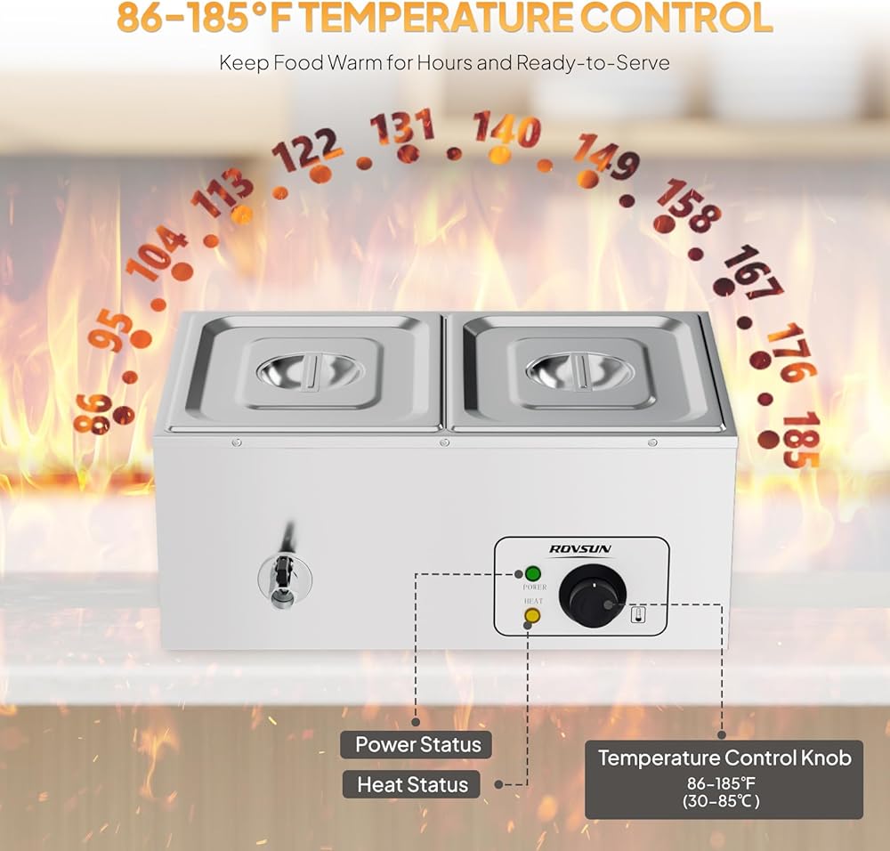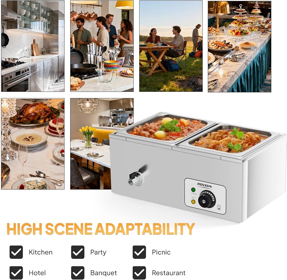 【Wide Usage】The commercial food warmer is perfect to keep nacho cheese, chicken wings, stews, eggs, porridge, soup, chili beans, milk, melt chocolate, etc. warm in restaurants, catering, parties, cafeteria, holidays and other places or events, satisfying your daily and commercial needs