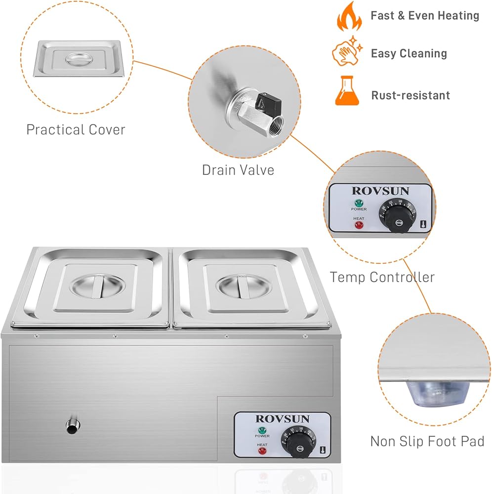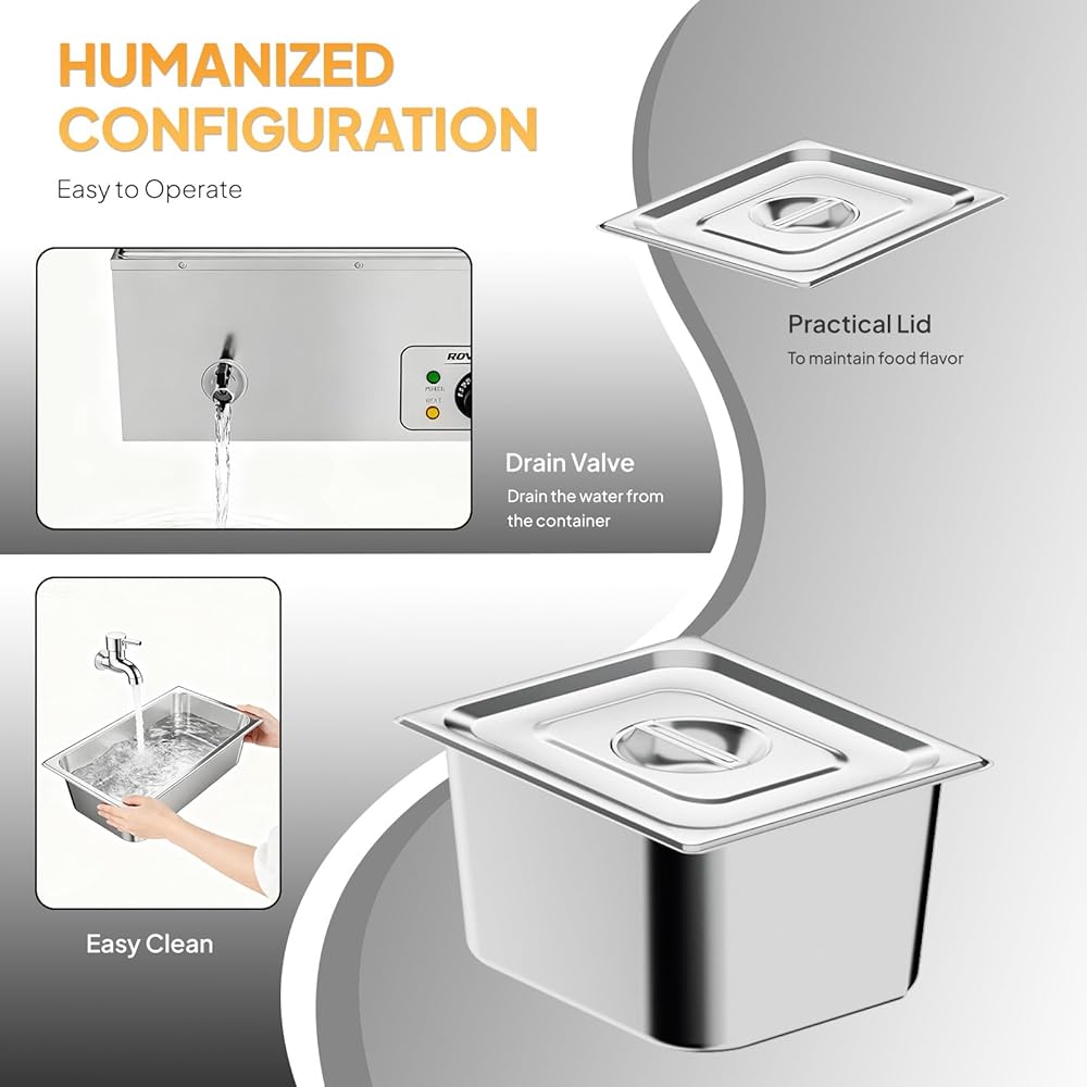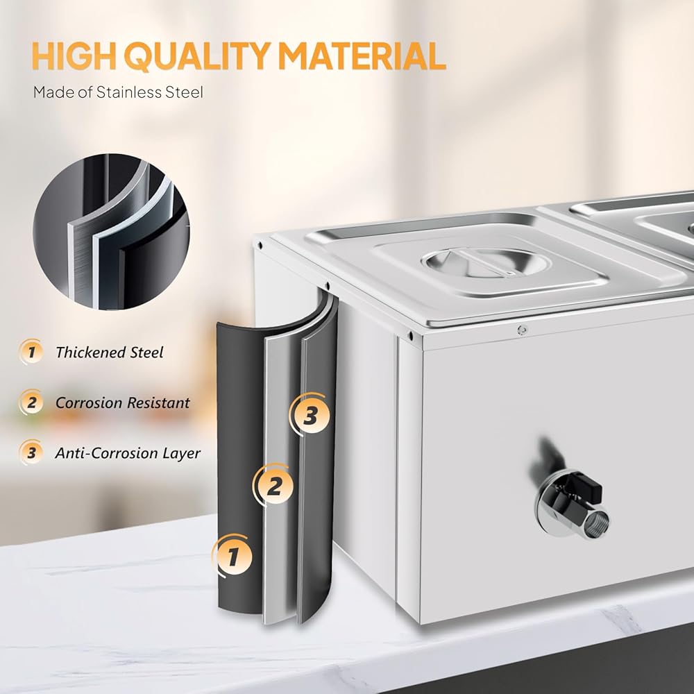 【Special Faucet Design】Equipped with a considerate faucet, the steam table is easy to operate and clean. Injecting and heating water to keep food warmer. Long-term insulation keeps the delicious taste of the food. Just open the faucet to drain the water from the container and then you could clean the container. (Warm Tips: Do not dry the heating tube and submerge it in water.)