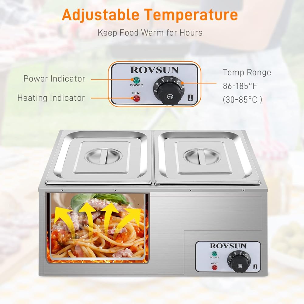 ROVSUN 21QT Electric Commercial Food Warmer, 2-Pan Steam Table Countertop, 10.6 QT/Pan Stainless Steel Bain Marie Buffet with Temperature Control & Lid for Parties, Catering, Restaurants 110V