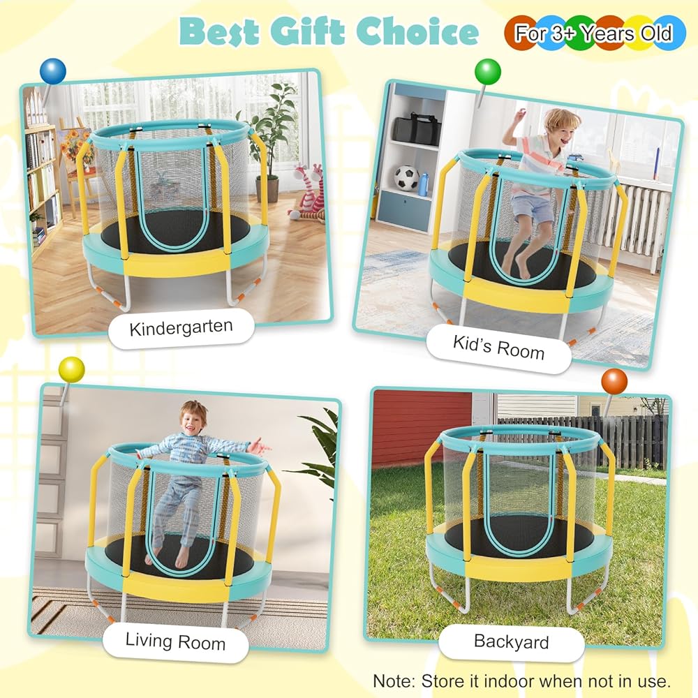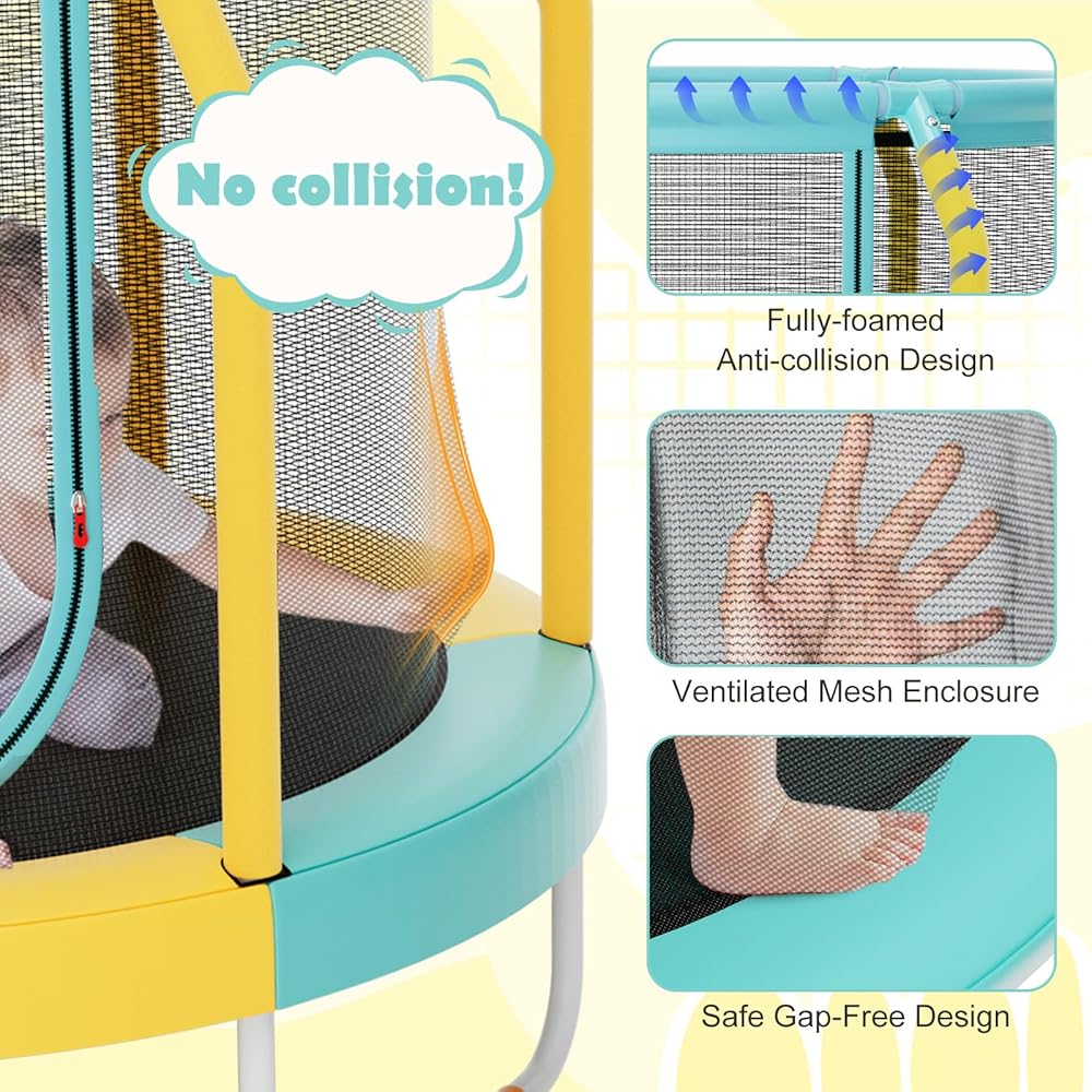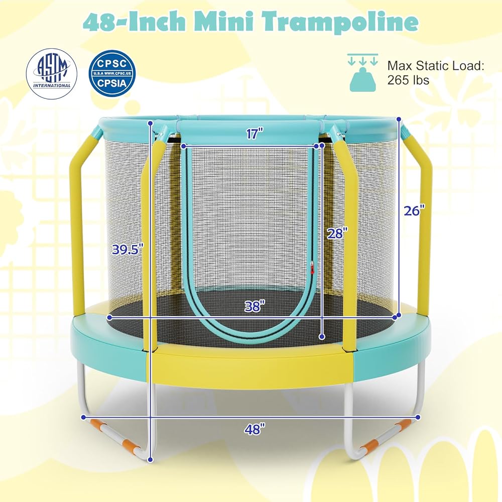 Looking for the ultimate bouncing experience? Giantex 48-Inch mini kids trampoline is guaranteed to give your kids a thrilling adventure and keep them entertained for hours. This round trampoline is built to withstand the test of time, thanks to its sturdy powder-coated metal tubes and U-shaped metal support legs that ensure unrivaled stability. With safety as our top priority, we've included a safety enclosure net and foam-wrapped poles to prevent any unanticipated falls. Plus, no worries about pinched toes, as the bungee cords are cleverly covered with a waterproof safety pad! Easy access is guaranteed with the convenient dual-sided zipper. Let the fun begin!