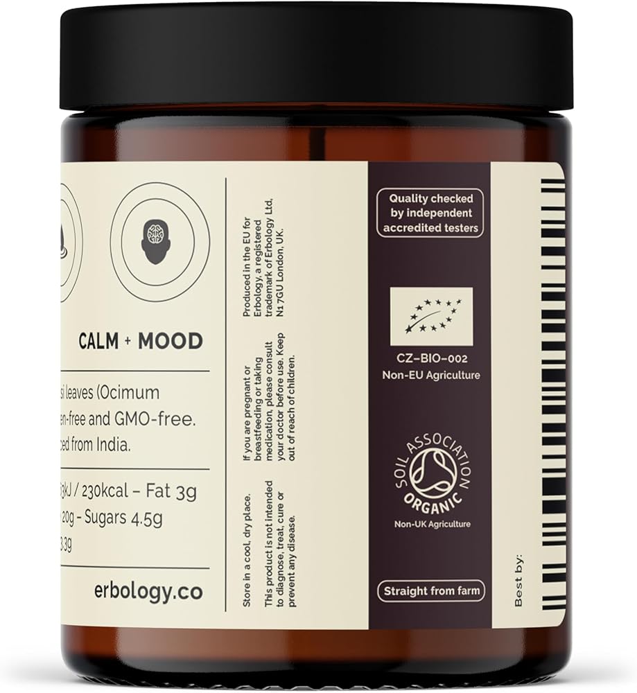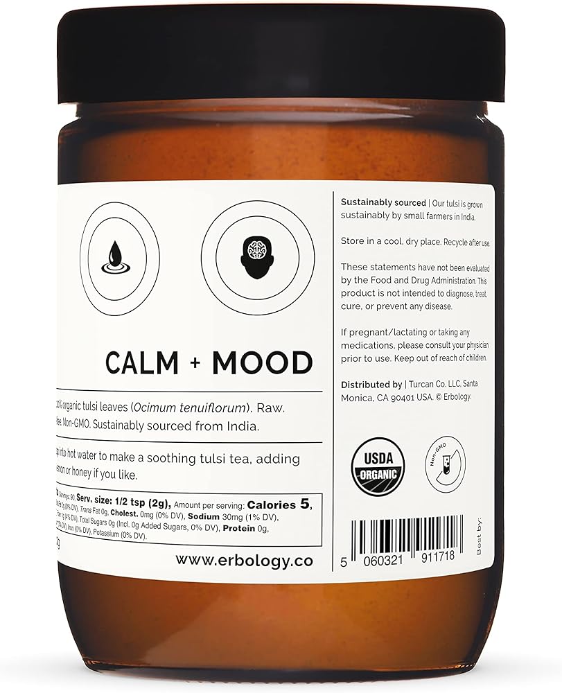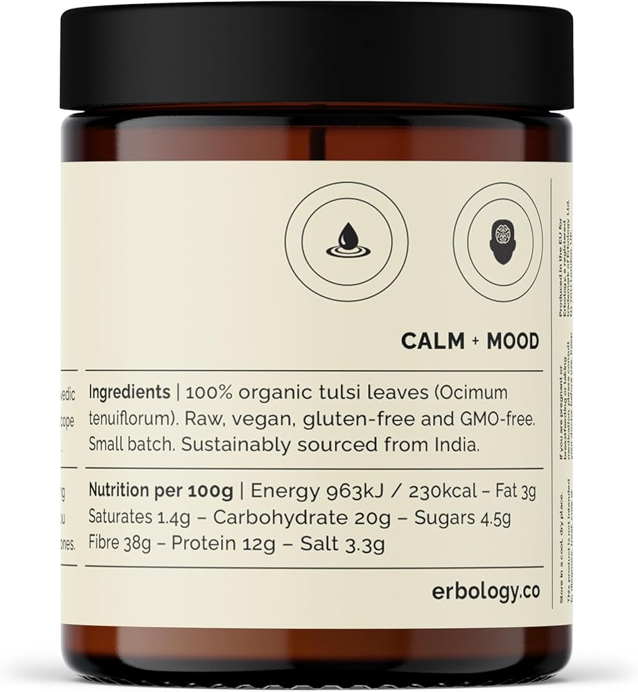 Erbology 100% Organic Tulsi Powder 6.4 oz - Holy Basil - Calm and Mood - Straight from Farm - Raw, Vegan and Gluten-Free - Non-GMO - No Additives or Preservatives - Recyclable Glass Jar