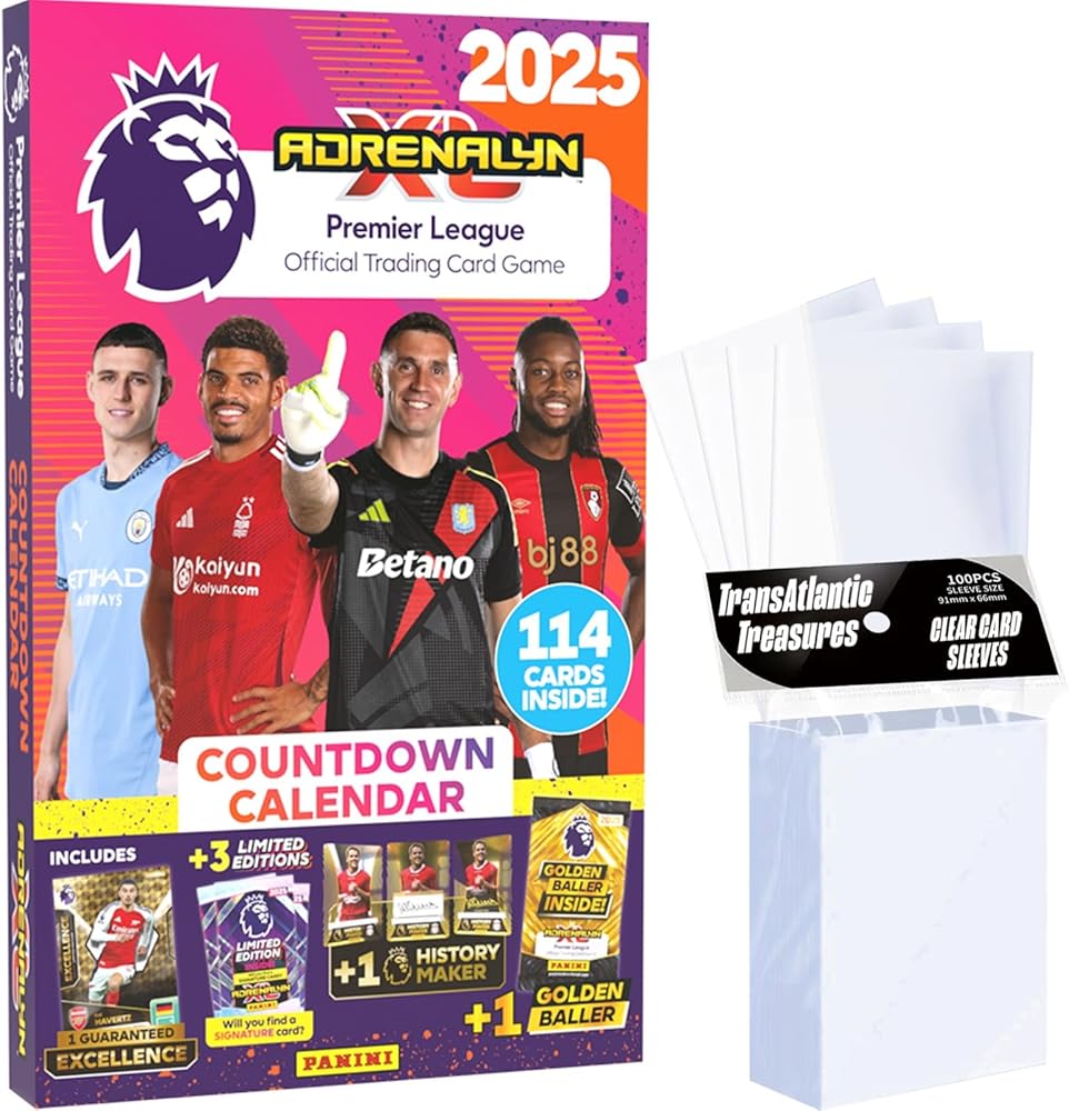 Start your collection with this Panini Premier League 2024/25 Adrenalyn XL Advent Countdown Calendar, perfect for Soccer Cards 2024-2025 and Premier League Soccer Cards enthusiasts! This exciting calendar features 18 packets, each containing 6 trading cards, plus a blind-wrapped Golden Baller card (1 of 8 versions). You'll also receive 3 blind-wrapped Limited Edition cards, with a chance to get standard, printed, or even authentic signature variants! Additionally, the calendar guarantees a Kai Havertz Excellence card and a Michael Owen Legend/History Maker Limited Edition card. Protect your collection with 100 card protectors included in this bundle, ensuring your prized cards remain in mint condition. Celebrate the Premier League with this must-have football card countdown!