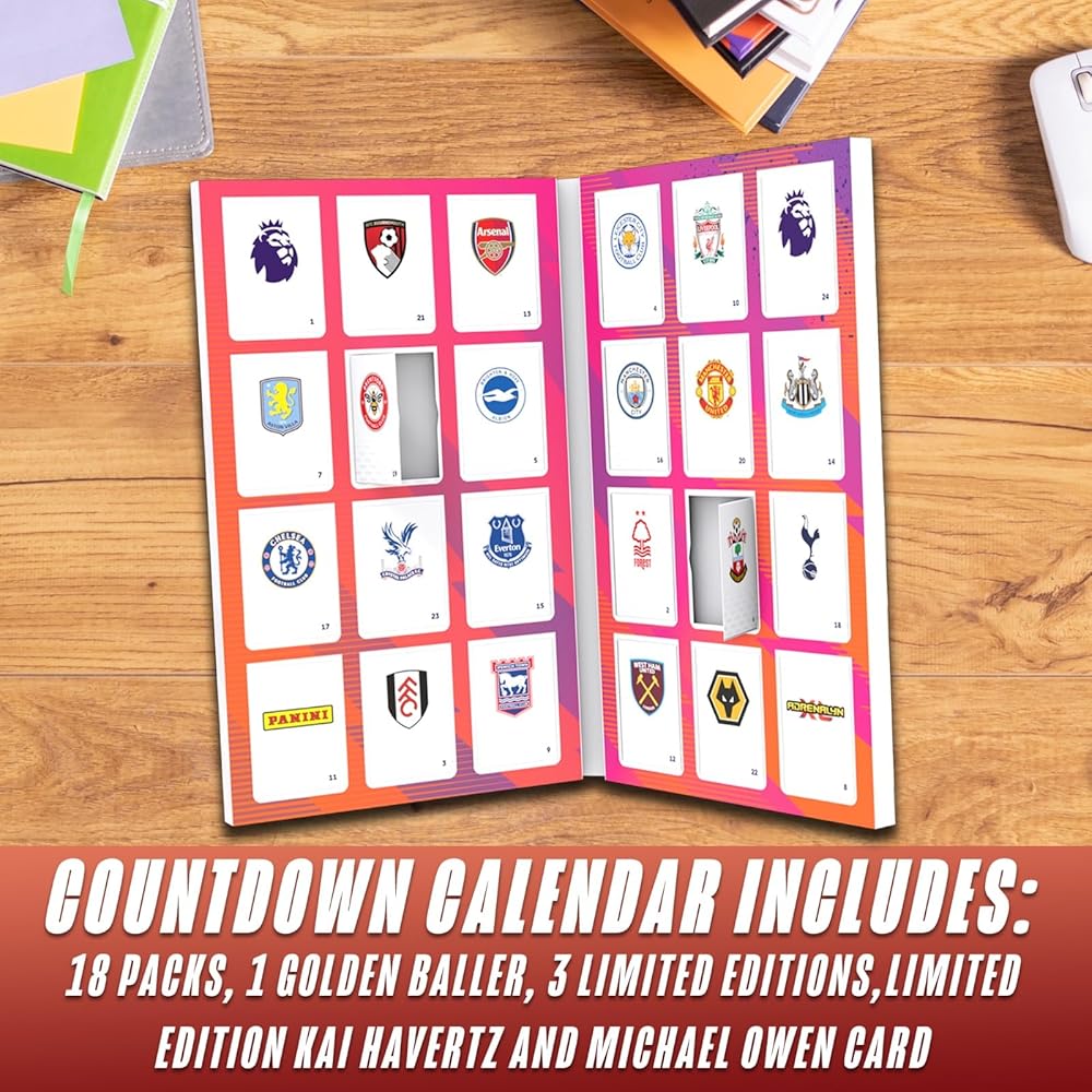 Soccer Trading Cards Panini 2024-2025 Advent Countdown Calendar - 114 trading cards, a blind-wrapped Golden Baller card (1 of 8 versions), 3 blind-wrapped Limited Edition cards, Kai Havertz Excellence card + Michael Owen Legend/History Maker Limited Edition card