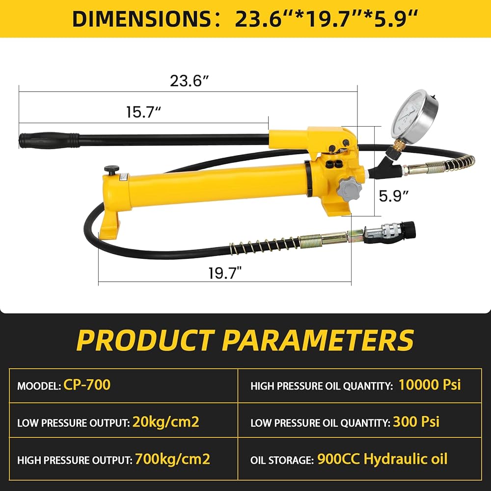 【Safety and Efficiency】The CP-700 hydraulic pump utilizes a fast two-stage oil discharge structure for faster oil discharge. It is equipped with wear-resistant and non-slip ZG3/8 thread locking fittings and 71-inch hoses for better sealing. The manual pump also features an extra-long, non-slip rubberized handle that saves time and increases efficiency