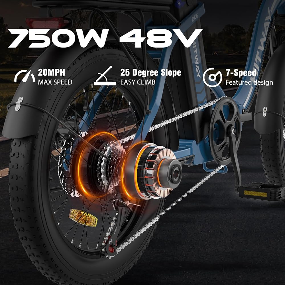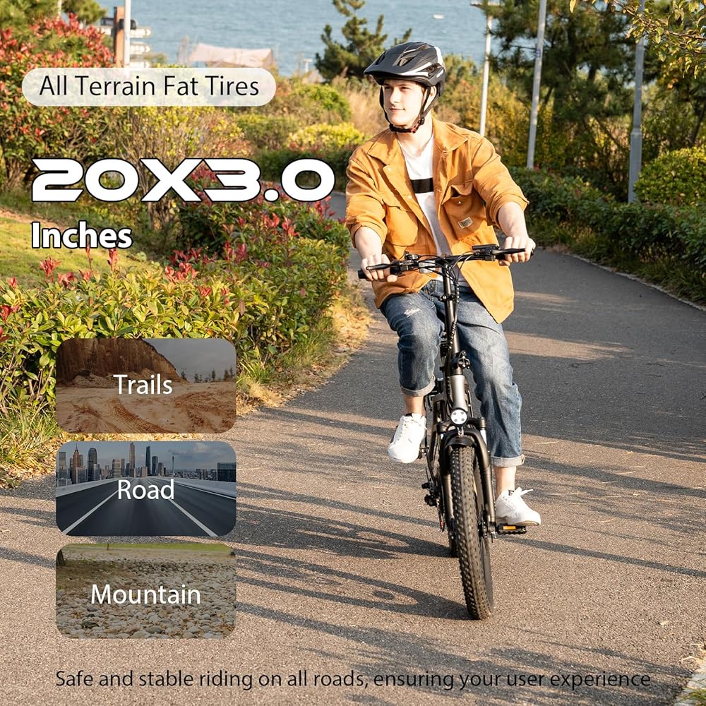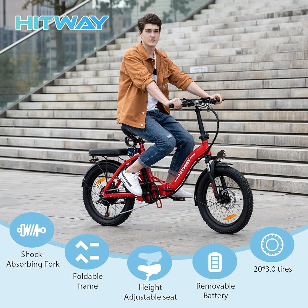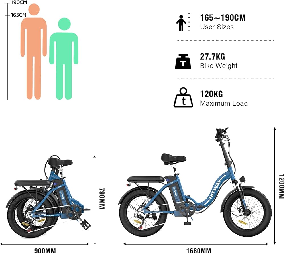Professional 20" Fat E-Bike: HITWAY electric bicycle is specially equipped with super-strong 3.0 professional fat tires, which are wear-resistant and anti-puncture. You can ride freely in the mountains, in the city, and explore nature. You can do it enjoy shuttle in snow, sand, and other places. Super Powerful Motor, Super Long Distance: The HITWAY e-bike is equipped with a 750W 48V motor, which can easily climb a 25-degree slope. Built-in14Ah removable battery. Depending on the mode, the maximum range can be up to 55-120km for 4-5 hours on a single charge. If you like thrills and challenges, you can also ride this mountain bike for a non-stop adventure. Advanced Design: HITWAY bike features an aluminum alloy body, high strength and net weight is 27.7kg. The foldable design is easy to carry and space-saving. The hollow seat design is not only comfortable, but also avoids water accumulation. There's also an easy-to-read LCD display (which shows battery, mileage, speed, error codes, etc.) and headlights and reflectors to keep you safe. We recommend optimal user sizes between 165 cm and 190 cm. Improved Acceleration Mode: You can choose from 3 driving modes. (pure electric mode, manual mode and assist mode). In manual mode, 7-speed transmission system and mechanical transmissions can be realized, and you can experience a special acceleration experience. In assist mode, you can experience an unexpectedly fast driving experience. Excellent Shock Absorption: Equipped with a front suspension with front and seat shock absorbers, while high-volume low-pressure tires also act as additional shock absorbers, providing more balance and control on rough mountain roads. The front and rear double disc brakes and electronic brakes realize all-round safe driving protection. Note: The black electric bike has two battery types, 11.2Ah and 14Ah. The battery capacity determines the maximum riding mileage. The maximum mileage of 11.2Ah battery is 45-90KM, and 14Ah is 55-120KM.