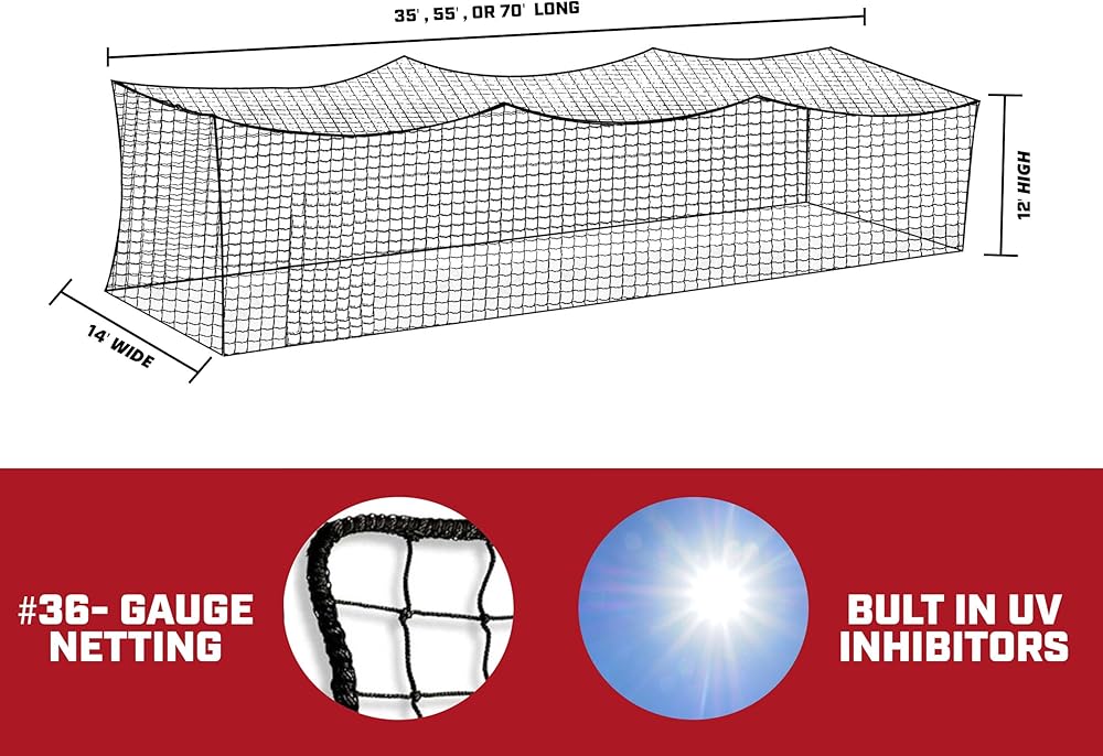 All of our Premium Batting Cage nets have a flap door, consisting of a 3-foot overlap, allowing one easy but safe access to the cage. The Premium net will have a longer life with an included 12' X 14' backdrop net, sewn into the top of the cage. Not only will your batting cage last longer, but also the athletes behind the batter will be protected from missed balls. Made of durable #36, 1-3/4" or 1-7/8" UV treated knotted square mesh. Able to withstand heavy use and nearly any weather conditions. Our strongest netting material - ideal for all levels of play including college. Our nets have built in UV inhibitors, not dipped & dyed like many other companies. Our Premium Nylon Batting Cage Nets, made for professional level baseball and softball, are able to withstand daily heavy use and nearly any weather condition, while our lighter Poly Batting Cage Nets are the perfect choice for backyard batting cages, youth leagues, or high school batting practice. Your athletes and coaches will be protected from missed balls with our netting for batting cage options allowing them to focus on their practice. Don't see the perfect fit for you? We offer Custom Batting Cage Nets and will happily tailor our netting to fit your batting cage needs. Have questions? Contact one of our batting cage netting experts today or check out our facility features where we highlight the indoor sports facilities, fields, and even the occasional basement or backyard batting cage that we've helped design, outfit, and install.