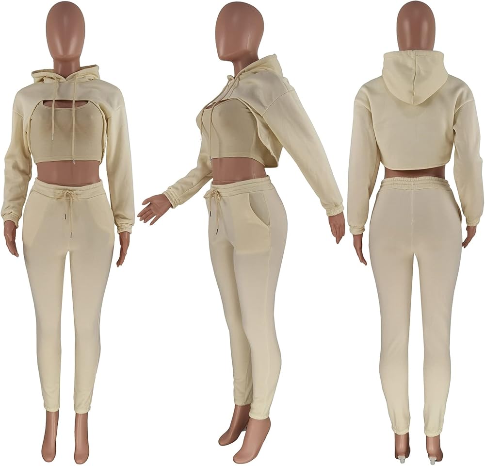 Feature: fall 3 piece outfits matching lounge sets, solid color, long sleeve pullover hoodie, u neck tank crop tops, high waisted long pants with drawstring, jogger tracksuit sets, women 3 piece outfits sweatsuits set