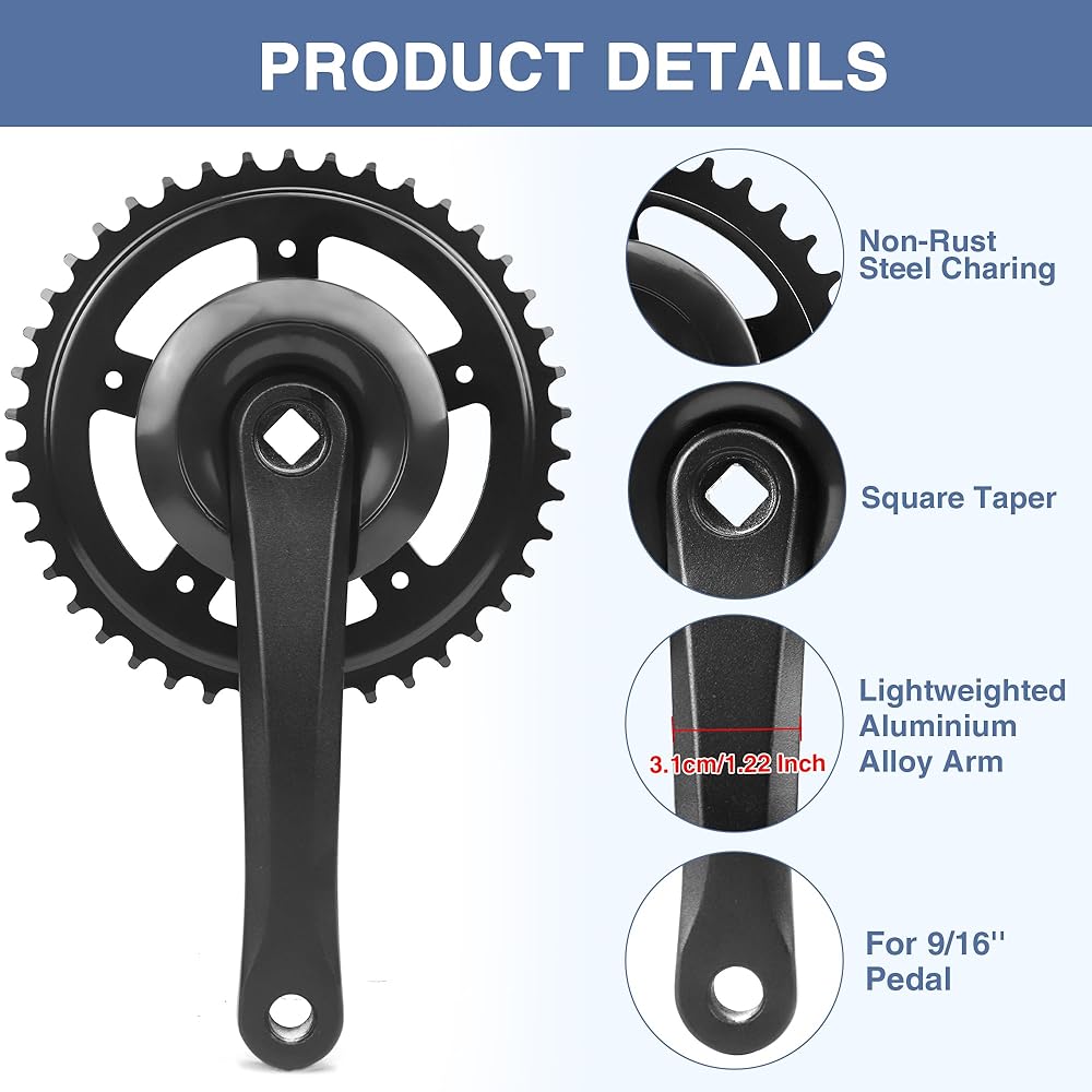 Durable for long lasting use:The bike crankset is made of Steel,aluminum alloy crank arm,makes it durable for long lasting use.Suitable for Ladies Bike/Folding Bike/Cruiser Bike/Mountain Bike.