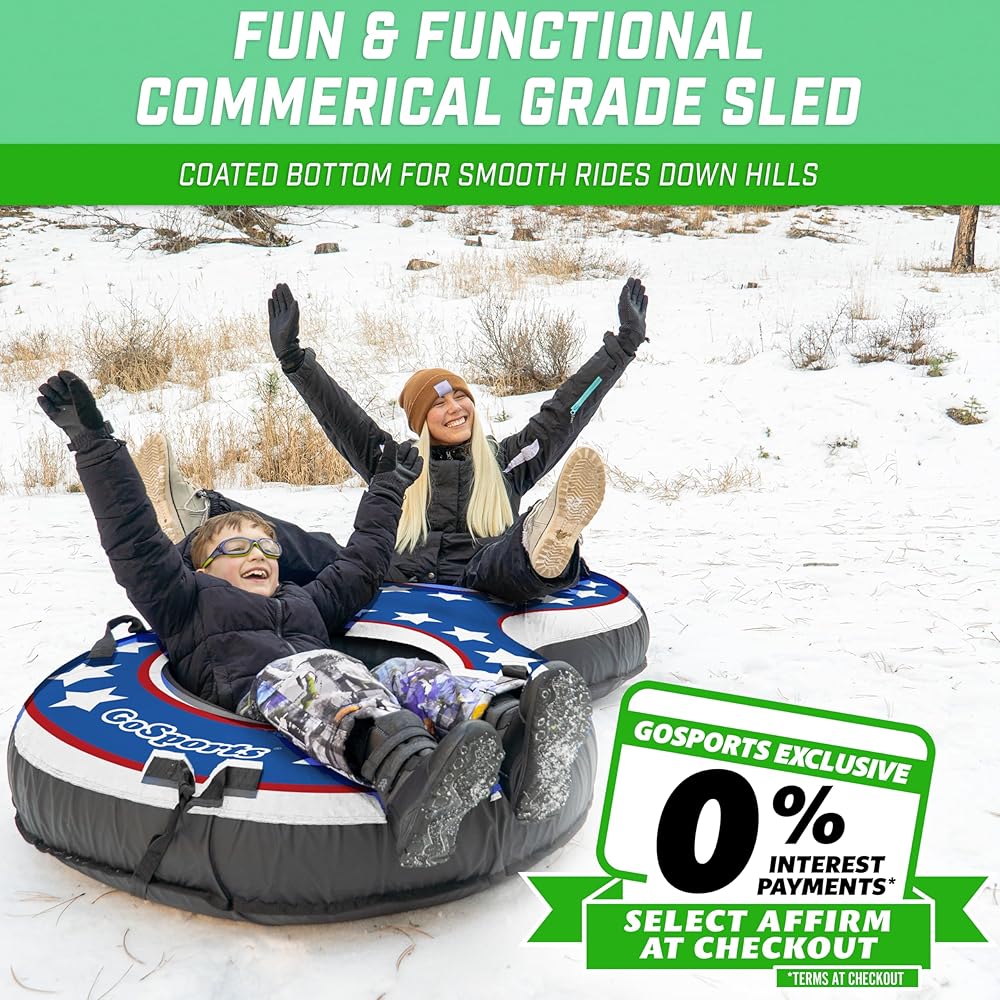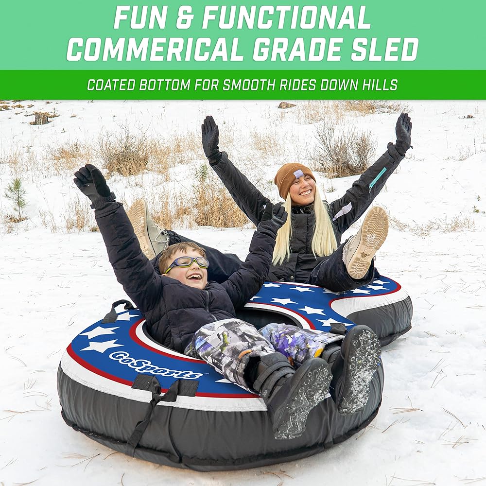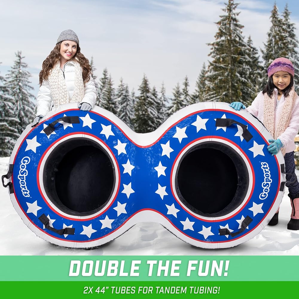 Winter just got more exciting! The GoSports 2 Person Snow Tube is commercial grade and features two adjoining 44 in DuraTubes encased by a high-quality canvas cover. The double stitched canvas cover has built-in stability grip handles and is made to hold two adults up to 250 lbs per tube. The slick coated bottom allows you and your partner to glide down snowy hills with ease and comfort for an optimal sledding experience. Furthermore, our no poke inflation valve works with any standard air compressor and is designed to stay out of your way while riding. Also, we included a hand strap so you can effortlessly tow the tube behind you. Get outside and enjoy the snow this winter with GoSports 2 Person Snow Tube!.