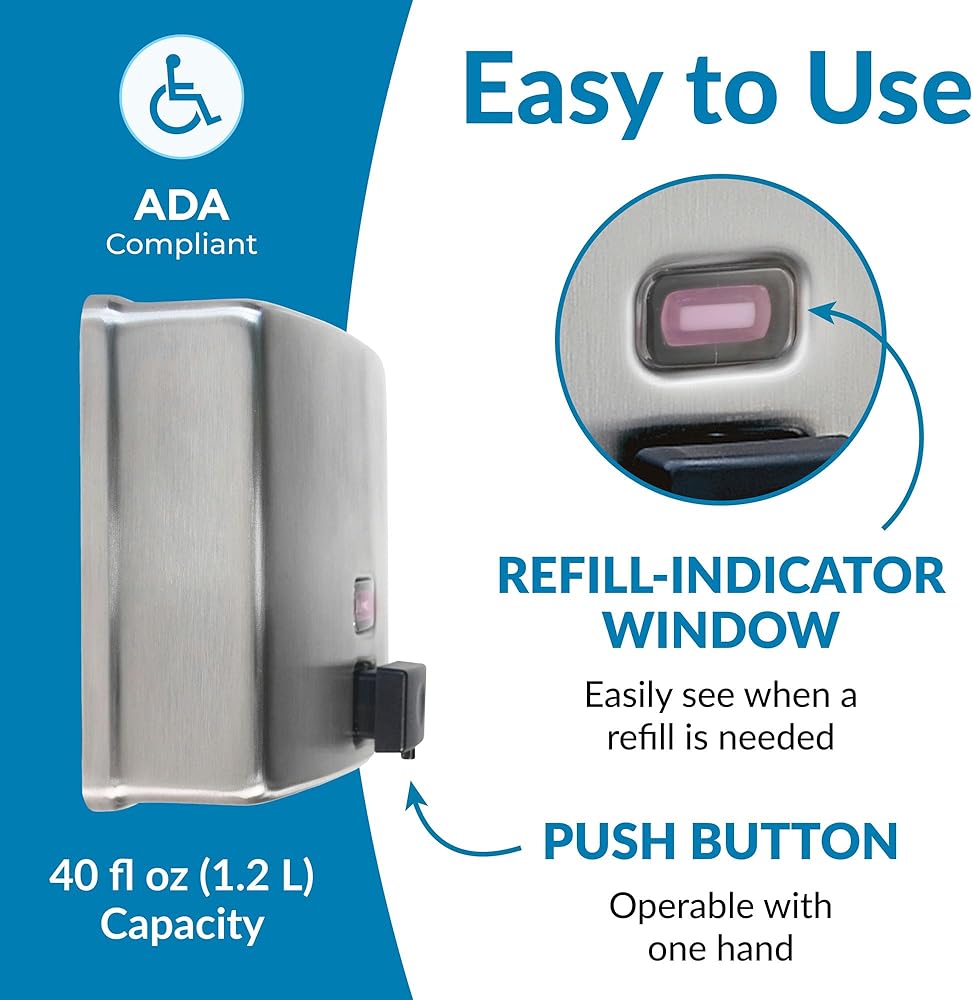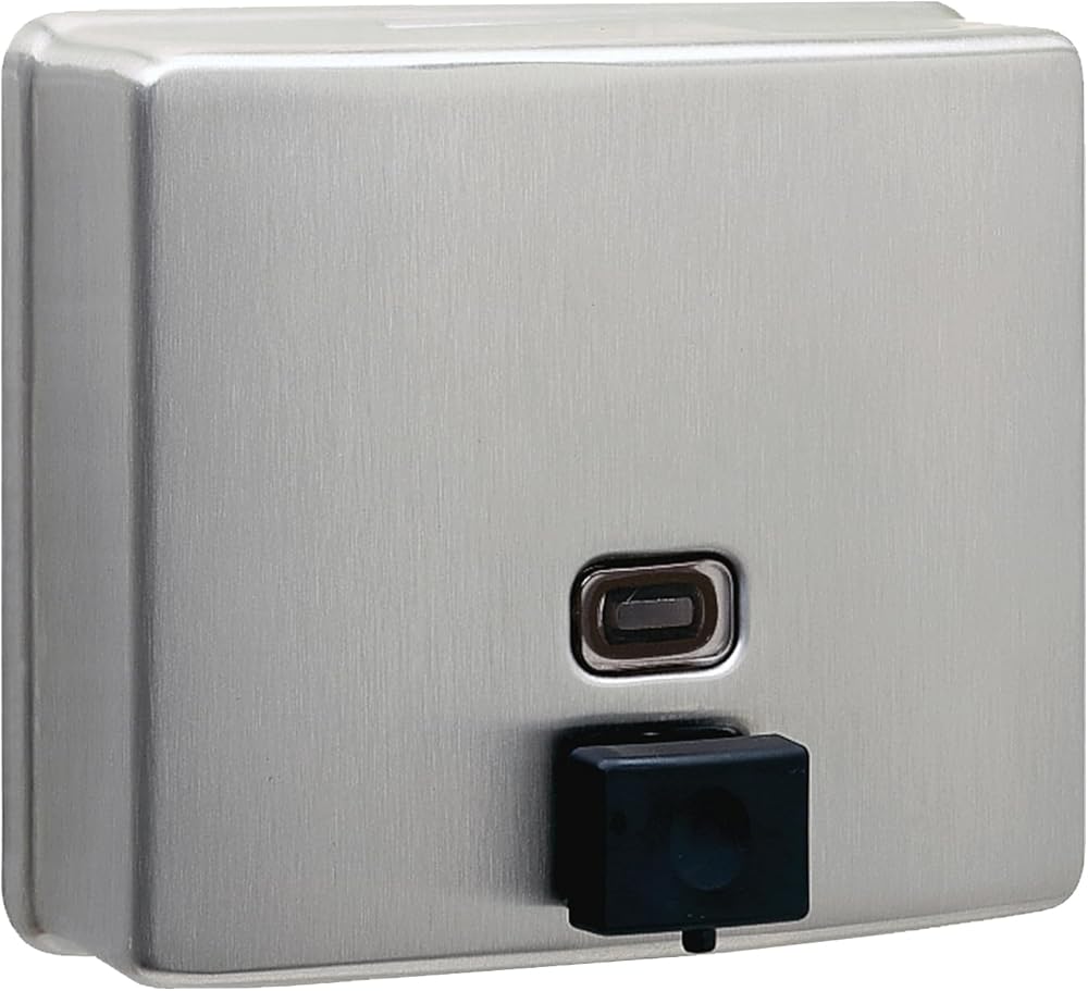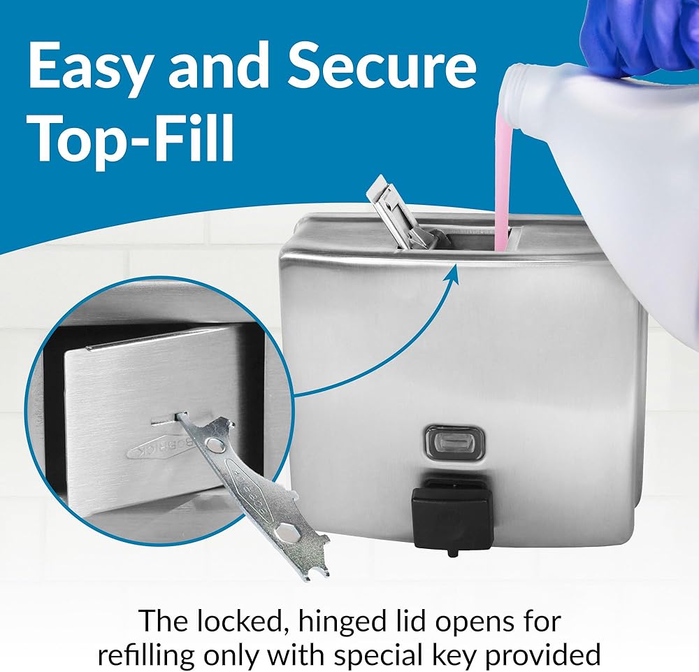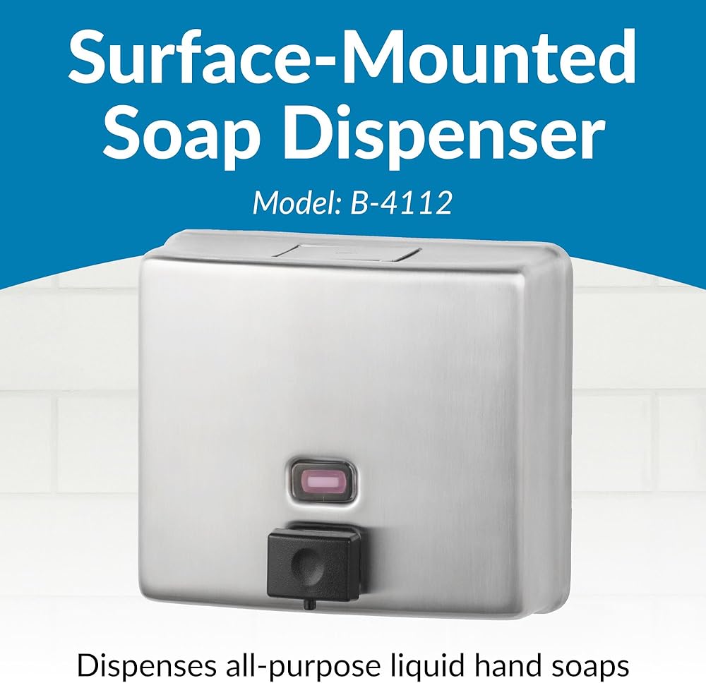 Introducing the Bobrick Surface-Mounted Soap Dispenser, Vertical Tank Satin-Finish Stainless Steel (Model B-2111), a premium solution for maintaining hygiene in high-traffic restrooms. This dispenser seamlessly blends robust construction with user-friendly features, making it an ideal choice for commercial, institutional, and public spaces. Crafted from Type-304, 22-gauge stainless steel with a satin finish, the Bobrick B-2111 is designed for durability and elegance. The seamless, one-piece construction ensures long-lasting performance and resistance to corrosion, making it perfect for demanding environments. The sleek satin finish not only enhances the dispenser's aesthetic appeal but also makes it easy to clean, maintaining a pristine look over time. The dispenser features a generous 40-fl oz (1.2-L) capacity, significantly reducing the need for frequent refills. This high capacity ensures that soap is always available to users, even in the busiest restrooms, enhancing user satisfaction and minimizing maintenance efforts. The clear acrylic refill indicator window provides a convenient way to monitor soap levels immediately, ensuring timely refills and uninterrupted service. One of the standout features of the Bobrick B-2111 is its manual operation, designed for ease of use and accessibility. The black molded plastic push button is operable with one hand, without tight grasping, pinching, or twisting of the wrist, and requires less than 5 pounds of force to dispense soap. This user-friendly design complies with ADA guidelines, making it accessible to all users, including those with disabilities. The design of this dispenser prioritizes security and vandal resistance. The unit has a concealed wall fastening system and a locked, hinged lid that opens only with a unique key. This feature ensures that the dispenser remains secure and functional in public restrooms, reducing the risk of tampering and theft. Installation is straightforward and versatile, accommodating various wall types. The dispenser comes with all necessary hardware for secure mounting, including sheet-metal screws, fiber plugs, and expansion shields. Detailed installation instructions ensure a hassle-free setup, whether mounting on plaster, drywall, or other surfaces. The Bobrick Surface-Mounted Soap Dispenser is designed to dispense commercially marketed all-purpose liquid soaps. To prevent the tank from corroding, it is recommended to use chloride-free, pH-neutral liquid soaps. The corrosion-resistant valve ensures reliable performance and longevity, maintaining hygiene standards.