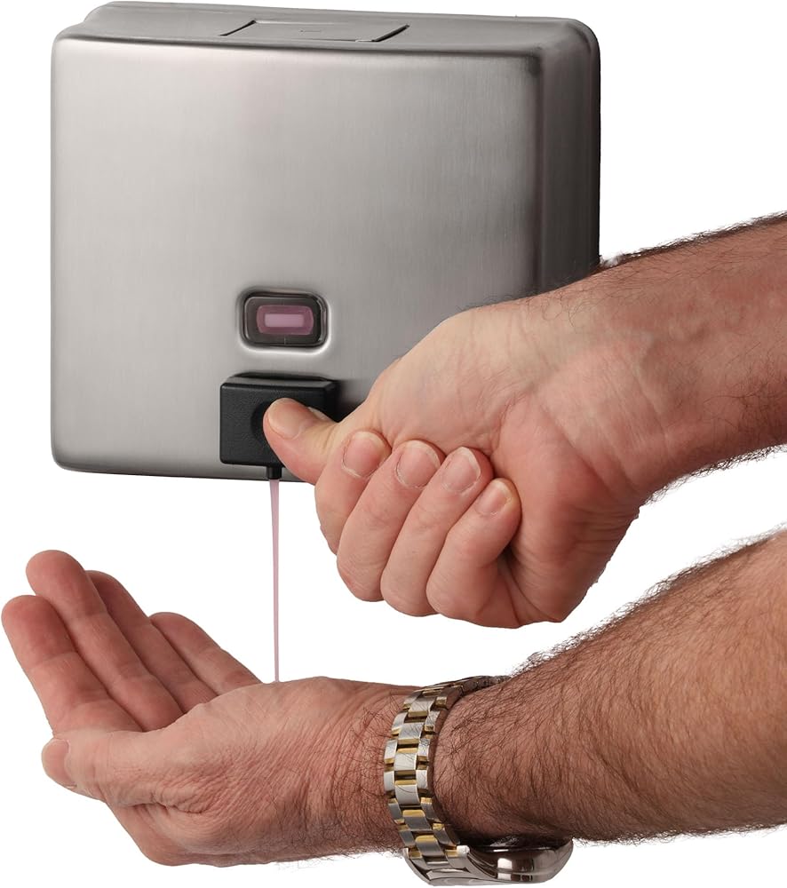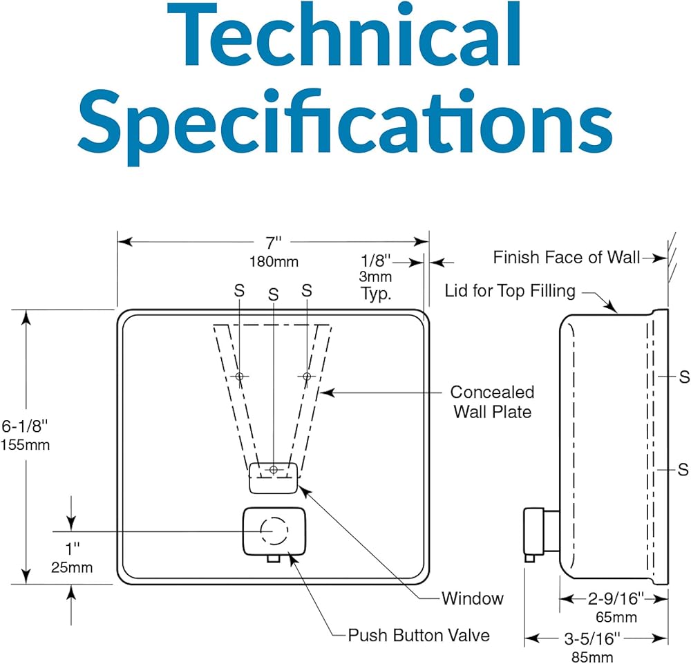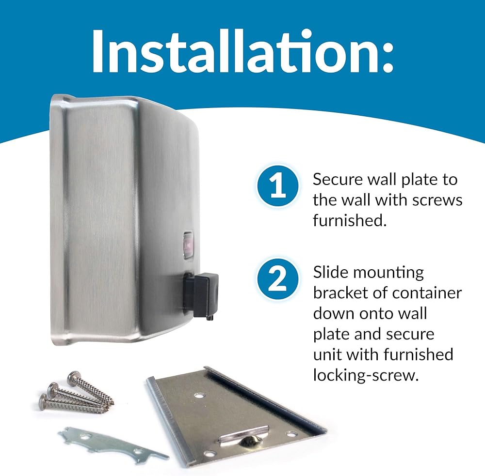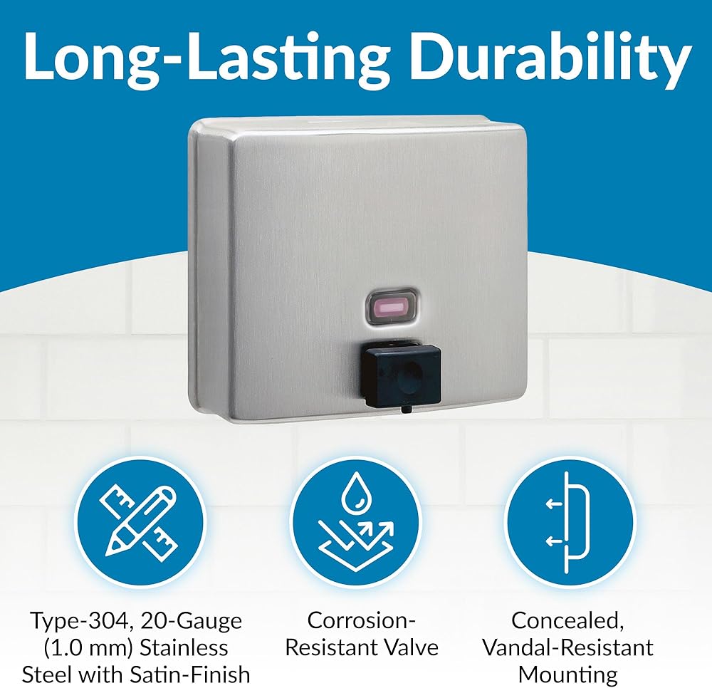 Introducing the Bobrick Surface-Mounted Soap Dispenser, Vertical Tank Satin-Finish Stainless Steel (Model B-2111), a premium solution for maintaining hygiene in high-traffic restrooms. This dispenser seamlessly blends robust construction with user-friendly features, making it an ideal choice for commercial, institutional, and public spaces. Crafted from Type-304, 22-gauge stainless steel with a satin finish, the Bobrick B-2111 is designed for durability and elegance. The seamless, one-piece construction ensures long-lasting performance and resistance to corrosion, making it perfect for demanding environments. The sleek satin finish not only enhances the dispenser's aesthetic appeal but also makes it easy to clean, maintaining a pristine look over time. The dispenser features a generous 40-fl oz (1.2-L) capacity, significantly reducing the need for frequent refills. This high capacity ensures that soap is always available to users, even in the busiest restrooms, enhancing user satisfaction and minimizing maintenance efforts. The clear acrylic refill indicator window provides a convenient way to monitor soap levels immediately, ensuring timely refills and uninterrupted service. One of the standout features of the Bobrick B-2111 is its manual operation, designed for ease of use and accessibility. The black molded plastic push button is operable with one hand, without tight grasping, pinching, or twisting of the wrist, and requires less than 5 pounds of force to dispense soap. This user-friendly design complies with ADA guidelines, making it accessible to all users, including those with disabilities. The design of this dispenser prioritizes security and vandal resistance. The unit has a concealed wall fastening system and a locked, hinged lid that opens only with a unique key. This feature ensures that the dispenser remains secure and functional in public restrooms, reducing the risk of tampering and theft. Installation is straightforward and versatile, accommodating various wall types. The dispenser comes with all necessary hardware for secure mounting, including sheet-metal screws, fiber plugs, and expansion shields. Detailed installation instructions ensure a hassle-free setup, whether mounting on plaster, drywall, or other surfaces. The Bobrick Surface-Mounted Soap Dispenser is designed to dispense commercially marketed all-purpose liquid soaps. To prevent the tank from corroding, it is recommended to use chloride-free, pH-neutral liquid soaps. The corrosion-resistant valve ensures reliable performance and longevity, maintaining hygiene standards.