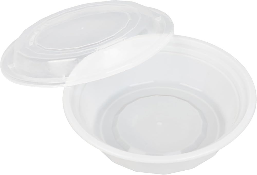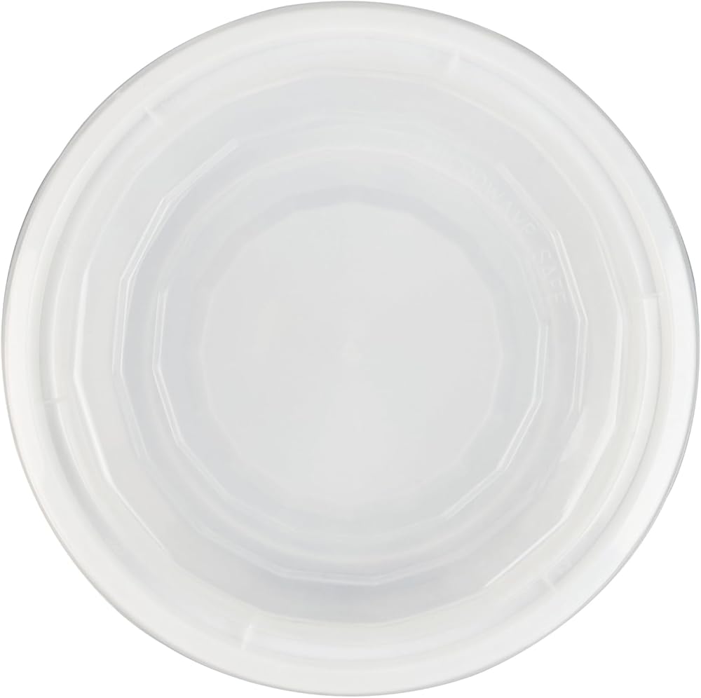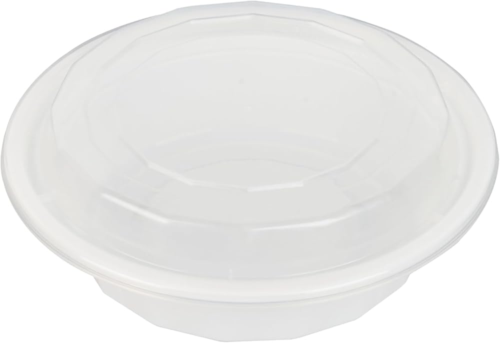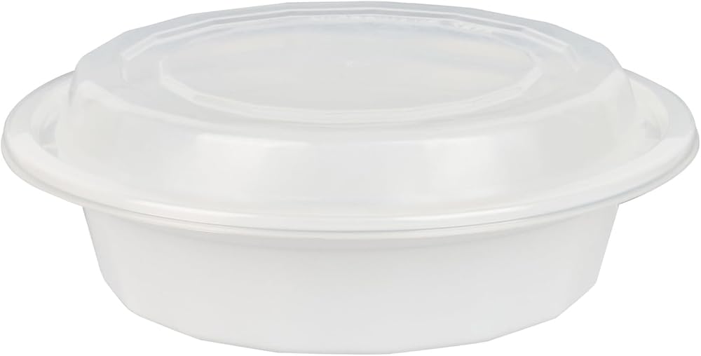 Conveniently package your customers' to go food with our Asporto 16-ounce Round White Plastic To Go Boxes. These round food containers are made from polypropylene plastic that does not contain BPA and are heat-tolerant, making them ideal for packing various types of food. With a tight-fitting clear plastic lid, these disposable carry out containers forms a secure seal that contains potential spills during transit. These food take out containers are microwavable to easily reheat meals without the need for transferring food to a different utensil. Each plastic to go box can hold up to 16 ounces, making them the perfect vessel for serving scrumptious meals. These white take out boxes are reprocessable to showcase your sustainable practices to your patrons and disposable to provide a swift cleanup solution. The white finish of these disposable carry out containers exudes a classy look to your take out orders. These plastic food containers measures 6.2 inches in diameter by 1.7 inches in height and have a capacity of 16 ounces. Sold in a 50 count box. NOTE: Lids are not for microwave use.