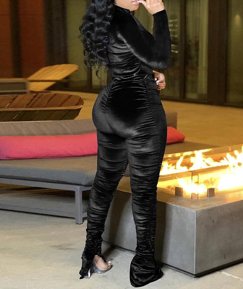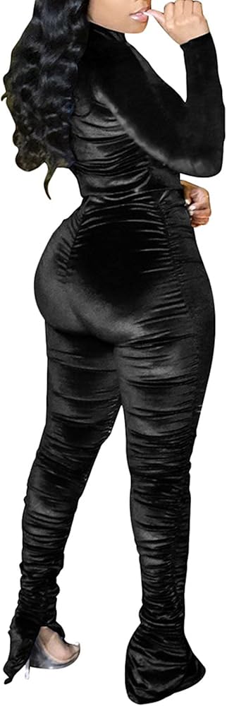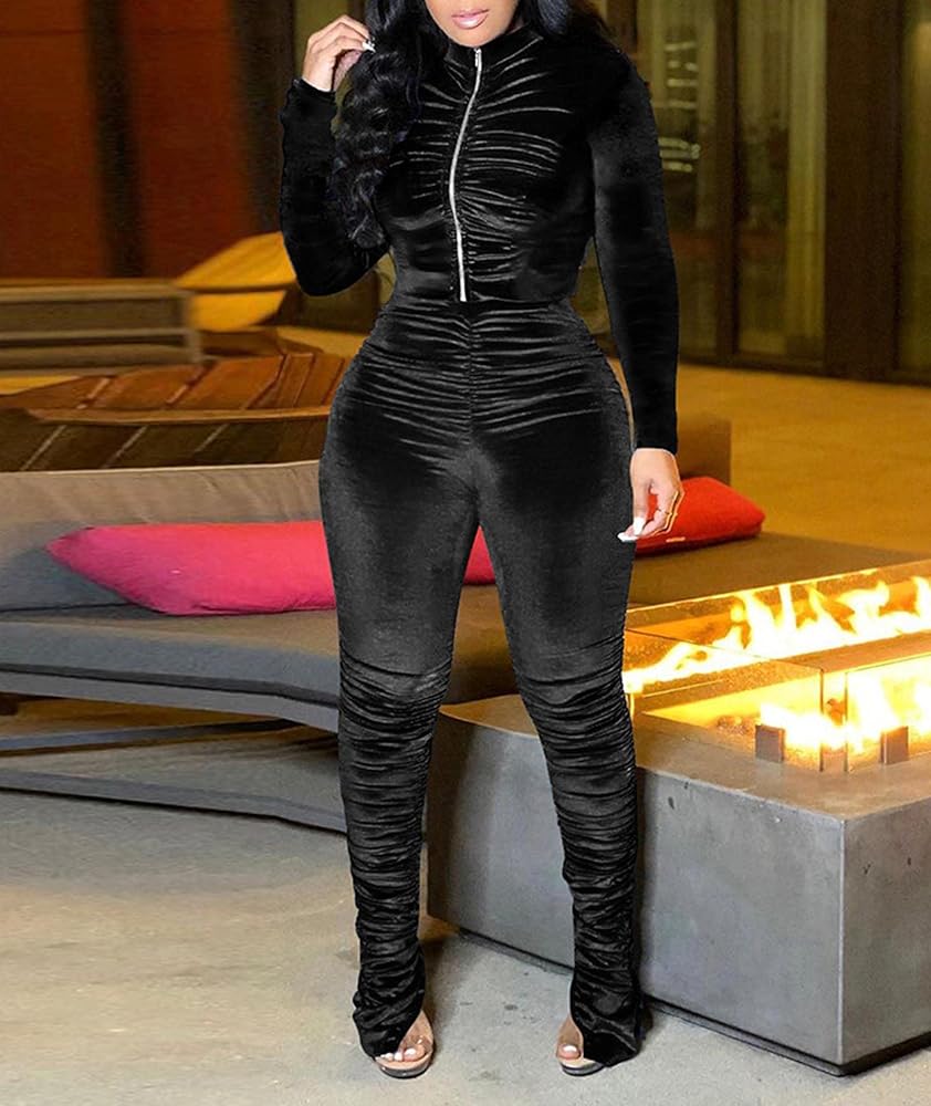 - Velour sweatsuits for women,solid color,full zipper long sleeve jackets,elastic high waist jogger pants with side slits,ruched design.