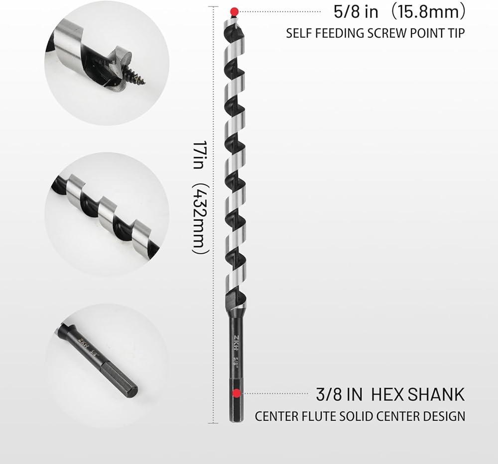 ZKH Auger Drill Bit for Wood, 5/8 x 17 Inch Long Auger Bit with 3/8" Hex Shank, High Carbon Steel Wood Drill Bit with Self-Positioning Tip, Smooth Drilling for Soft and Hardwood, Plastic, Drywall