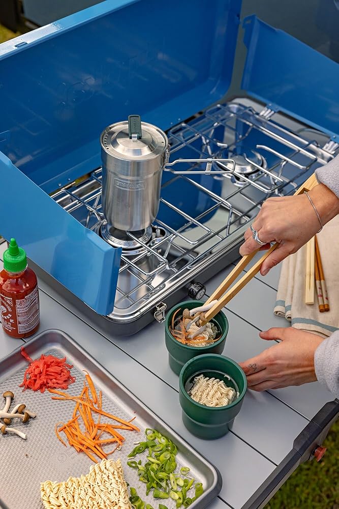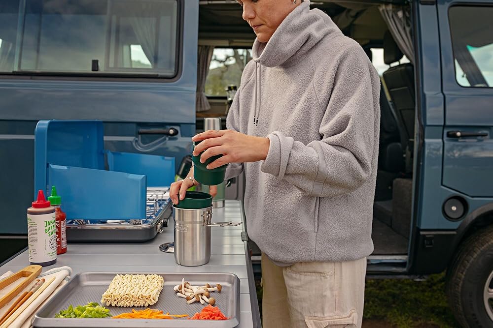 DURABLE CONSTRUCTION: Built tough for a camp cooking set, these camping must-haves cookset accessories feature 18/8 stainless steel that resists dents and breaks. The double-wall insulated cups keep drinks hot, while the exterior stays cool to touch.