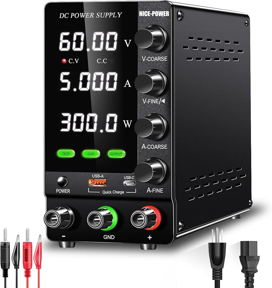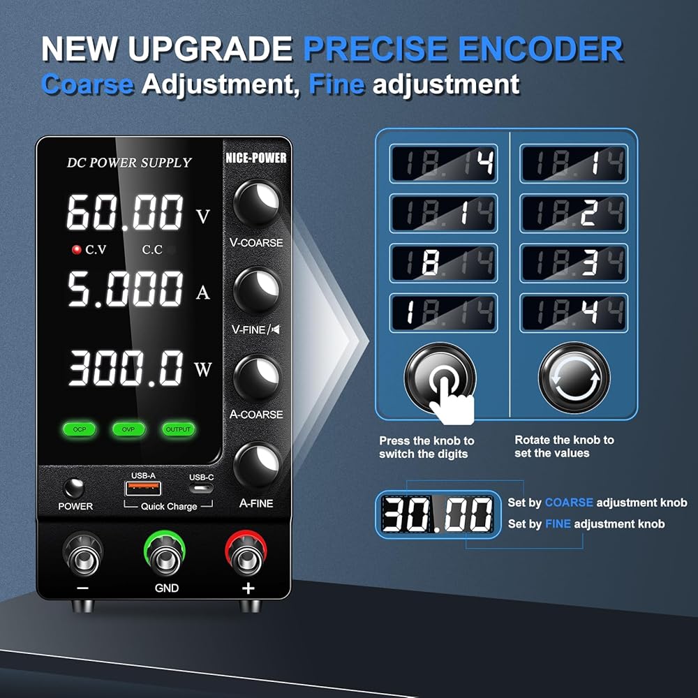 NICE-POWER DC Power Supply Variable 60V 5A, Adjustable Regulated DC Bench Power Supply with Encoder, Output Switch and OCP/OVP, Benchtop Lab Power Supplies 4-Digit LED Display with USB Quick Charge