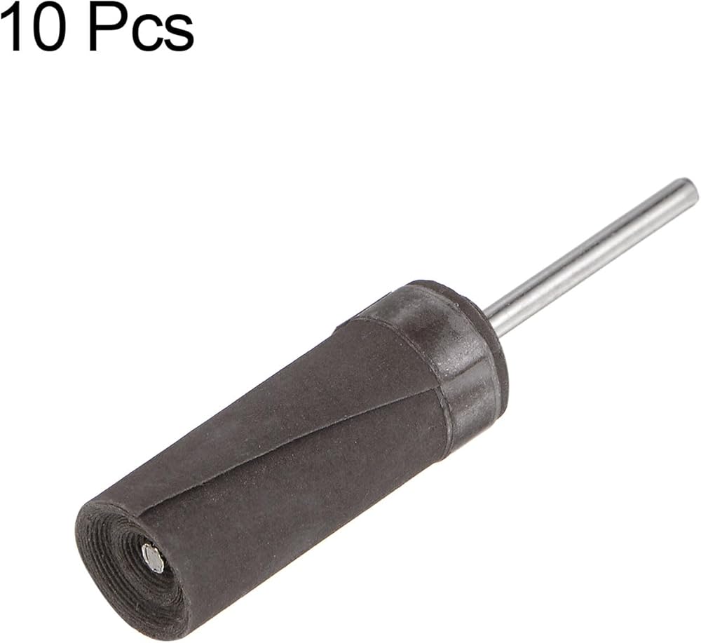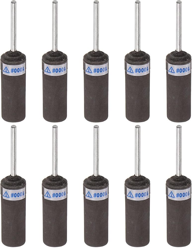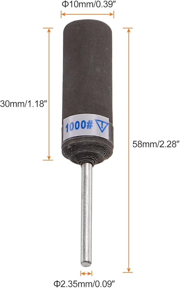Size - 10pcs 1000-grit sanding drum sleeves; 2.35mm shank diameter; sanding head with 10mm diameter and 30mm length; total length of 58mm.