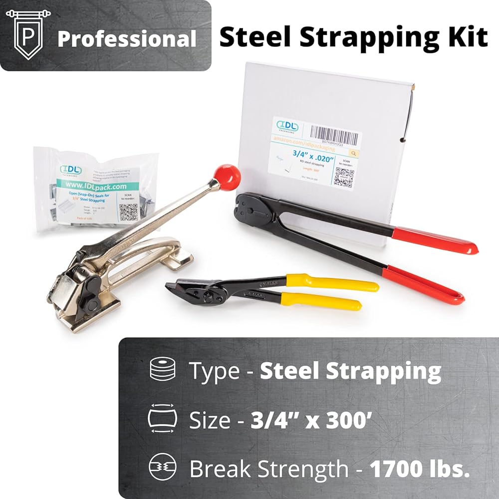 PRO STEEL STRAPPING KIT includes: 1 coil of 3/4 inch x 300 feet steel strapping, 1700 lbs break strength; pack of 150 open (snap-on) seals; S-296 steel strapping tensioner (manual heavy-duty steel banding tool ideal for flat packages); C-3126 double notched front action sealer/crimper (manual heavy-duty tool with 14-inch handle); H-201 strapping cutter