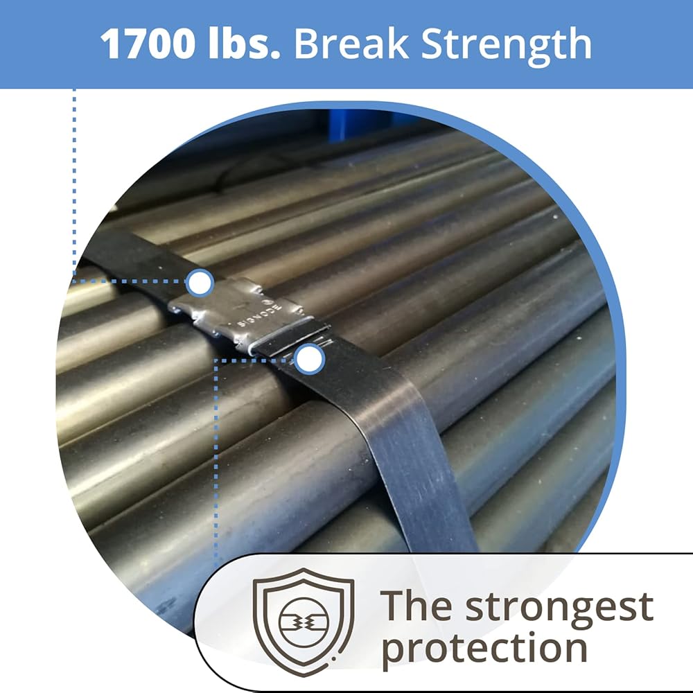 HIGHEST BREAK STRENGTH AND SHOCK RESISTANCE: Steel strapping kit is intended for extra-heavyweight load applications such as banding together stone, spools, brick, foam blocks, roofing materials etc. The resistance of steel strapping to cutting impacts from sharp objects and break strength are significantly superior than any other strapping can provide (Cord, Polyester, and Polypropylene)