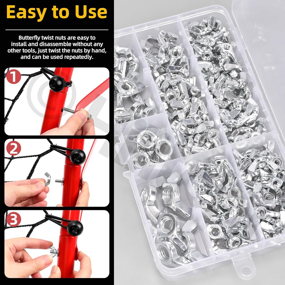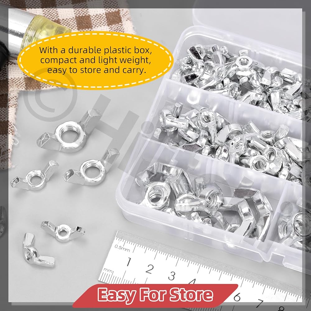 🎈【What You Will Get】In this kit, you will get 150pcs wing nuts in 6 sizes, which include 40pcs #6 wing nuts, 35pcs #8 wing nuts, 30pcs #10 wing nuts, 25pcs 1/4" wing nuts, 15pcs 5/16" wing nuts, 5pcs 3/8" wing nuts. They are all packaged in a box for easy storage and carry. The sufficient quantity and sizes can meet your different fastening needs.