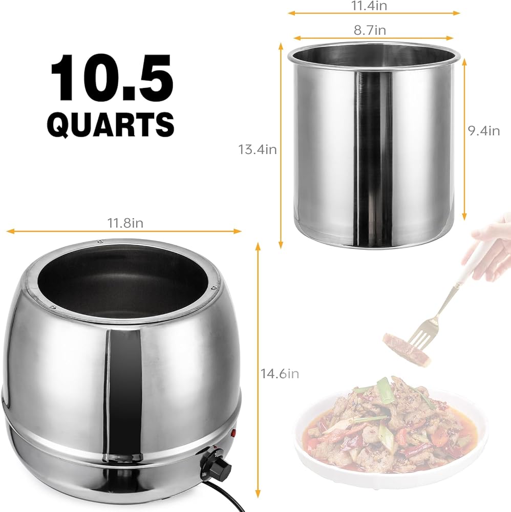 Silver Stainless Steel Commercial Grade Soup Warmer Temperature Control Feature, 10.5 10.5Qts with Stainless Steel Insert Pot and Spoon for Restaurants, Catering Events, and Family Gatherings
