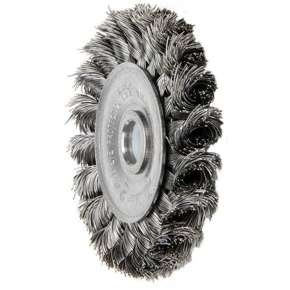 Weiler Wheel Brush, 3 in Brush Dia, 3/8 in Face Width, 1/2 to 3/8 in Arbor Hole Size, Standard/Twist Knot Filament/Wire Type, 0.014 in Filament/Wire Diameter, Steel Fill, 5/8 in Trim Length, 25000 rpm Maximum, Unthreaded Arbor Attachment. Weiler 3" Standard Twist Knot Wire Wheel Brush provides a heavy-duty brushing action with some flexibility for demanding deburring cleaning and surface preparation applications on somewhat irregular surfaces. Featuring Weiler's individual knot hole construction, these radial brushes are available in heat-treated steel, type 302 stainless steel and bronze wire for use in a wide variety of applications.5/8"-1/2" arbor hole for use on bench/pedestal grinder, die grinder, right angle die grinder and straight grinders. At Weiler, we passionately embrace change to improve our products and our processes to move the company and our customers forward. By bringing new ideas and creative problem solving together in an open, collaborative environment, we will improve our customers' productivity and create profitable growth. Weiler Abrasives is eager to create a collaborative partnership to overcome your toughest cleaning, grinding, cutting, de-burring and finishing challenges. Weiler manufactures precision brushes, abrasives, and maintenance products. The company was founded in 1898 in Germany, is headquartered in Cresco, PA, and is International Organization for Standardization (ISO) 9001 certified.