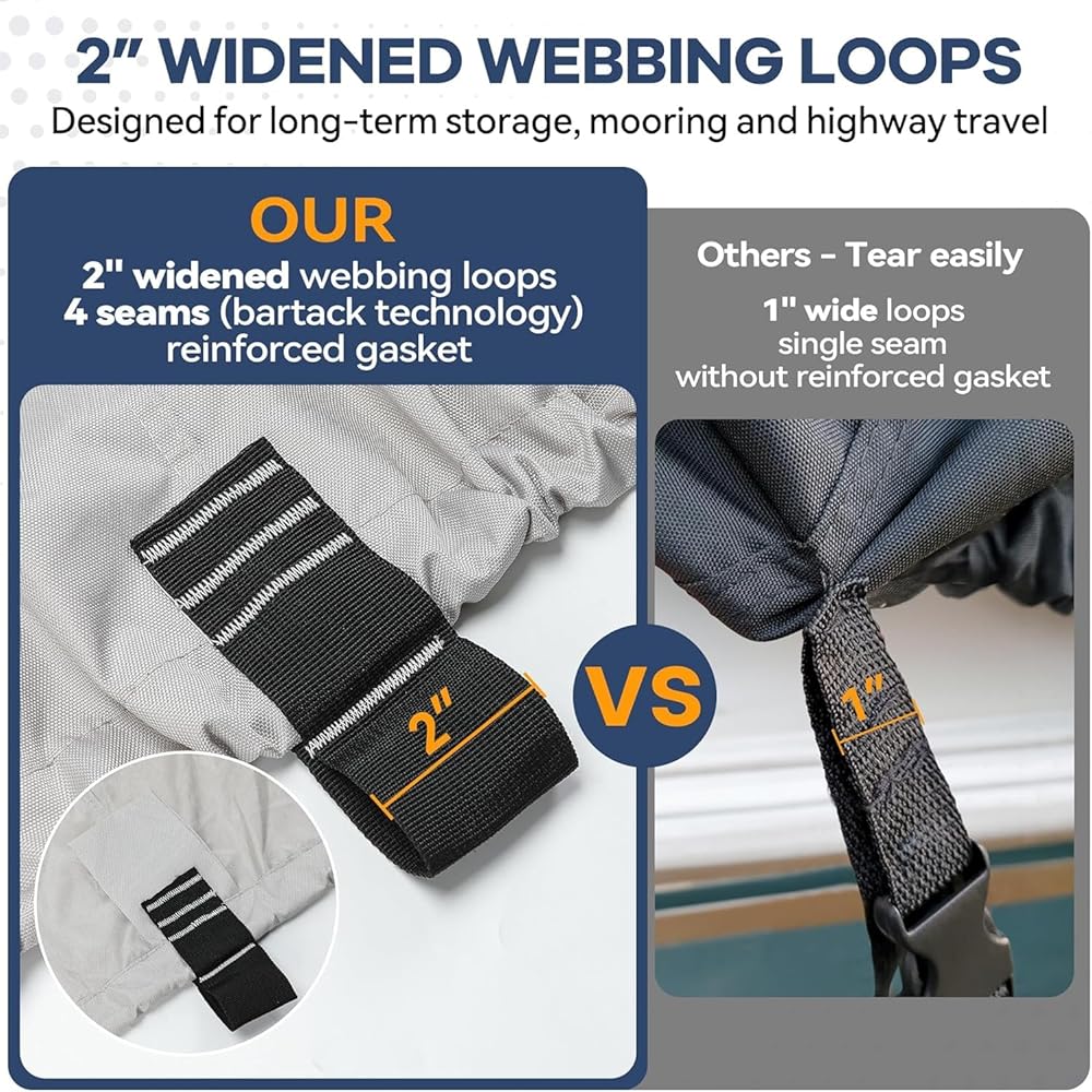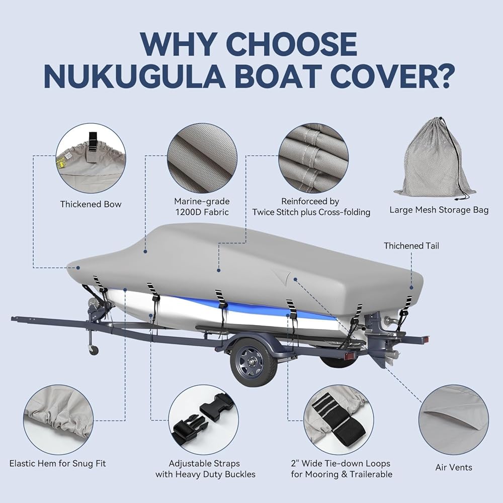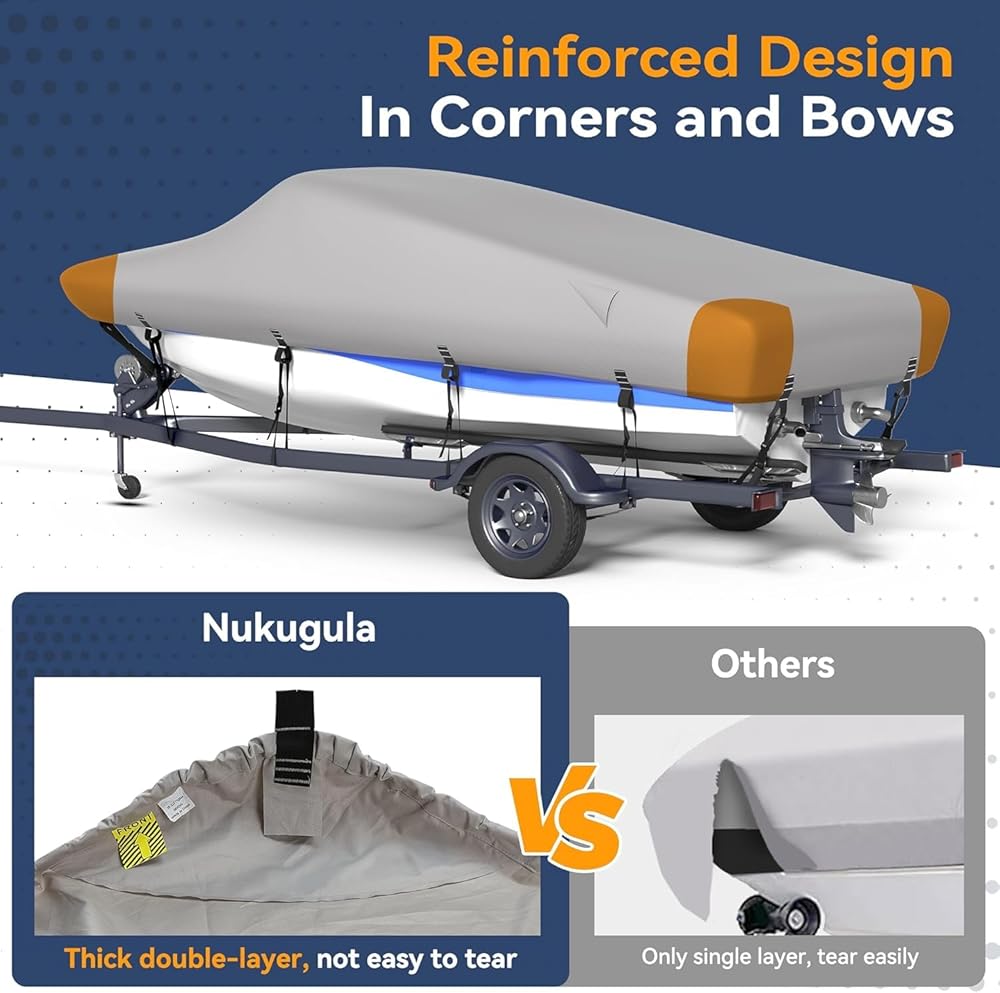 1200𝑫 𝑭𝒂𝒃𝒓𝒊𝒄 & 𝑫𝒐𝒖𝒃𝒍𝒆 𝑺𝒕𝒊𝒕𝒄𝒉𝒊𝒏𝒈 - 𝑴𝒐𝒓𝒆 𝑻𝒆𝒂𝒓 𝑹𝒆𝒔𝒊𝒔𝒕𝒂𝒏𝒕! Due to the 1200D heavy-duty marine grade solution-dyed polyester material and quadruple folded double stitching seam (Our stitching is very dense, with 6 stitches per inch), Nukugula boat covers have excellent tear resistance, scratch resistance, and UV resistance. And extra 3 reinforced design at bow and stern make the cover more durable.