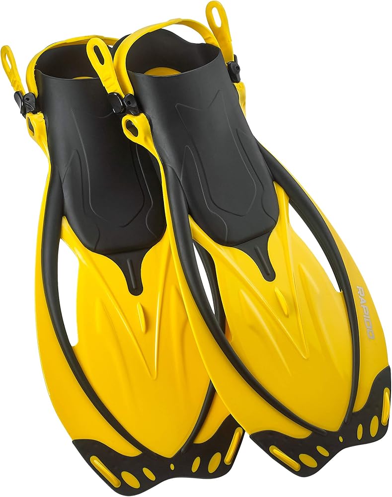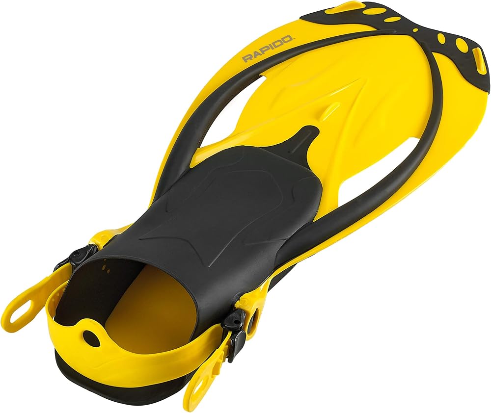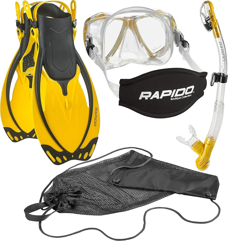 Great for both beginning and experienced snorkelers. Enjoy your next snorkeling adventure with the Rapido by Phantom Aquatics Mask Fin Snorkel Set. For increased speed, comfort and all-around performance, This all-inclusive set features a superior silicone face skirt for ultimate comfort, along with a single dual lens tempered glass mask for enhanced clarity. A one-way purge valve clears unwanted water out of your snorkel, while a dual-composite fin blade is designed to deliver speed and power while still conserving your energy as you explore the ocean blue . . . Fins Qualities: These fins are compact, making them perfect for traveling to your next vacation. They are designed to be comfortable on your foot, featuring quick-release adjustable straps and multiple sizes to ensure the ideal fit . . . Mask Qualities: The dual lens tempered glass lenses mask gives a very wide field of view. Compared with traditional masks, it increases the field of vision 30° degrees in all directions. The mask has a silicone double feathered edge skirt that is hypoallergenic, soft and comfortable; making this mask fit a wide range of faces. The profiled anatomical frame is streamlined and sits so close to the face that it seems to disappear from view when the mask is worn. Its extraordinary inverted tear drop lens visibility, together with extreme comfort, efficient adjusting low profile buckle system for the silicone strap makes this model a great choice for snorkeling . . . Snorkel Qualities: The Silicone Flex Snorkel is a dry-top design that when submerged will keep water from entering the breathing tube. Once back at the surface the dry top re-opens allowing normal water free breathing at the surface. If a small amount of water enters the snorkel tube it is easily expelled through the one-way purge valve below the mouthpiece. Snorkel has a contoured tube with flex section that allows the mouthpiece to drop away from the divers face making this a great snorkel for snorkeling. The mouthpiece is removable and replaceable and the snorkel comes equipped with a quick release snorkel keeper for attachment to the mask strap . . . Bag Qualities: The Rapido Boutique Collection Net Mesh Bag with drawstring closure and barrel lock fastener makes it perfect for fin transport. The Net Style Mesh allows you to rinse the Fins while still in the bag and hang to drip dry.