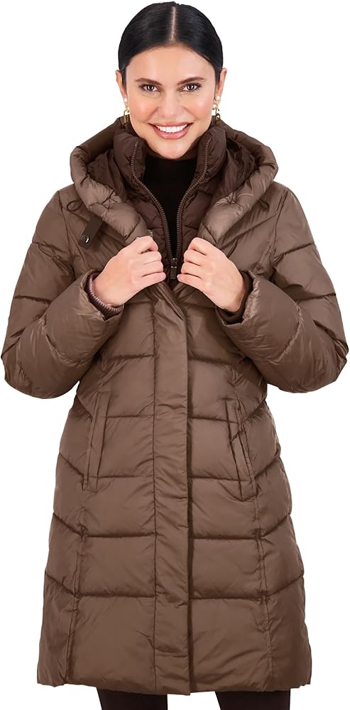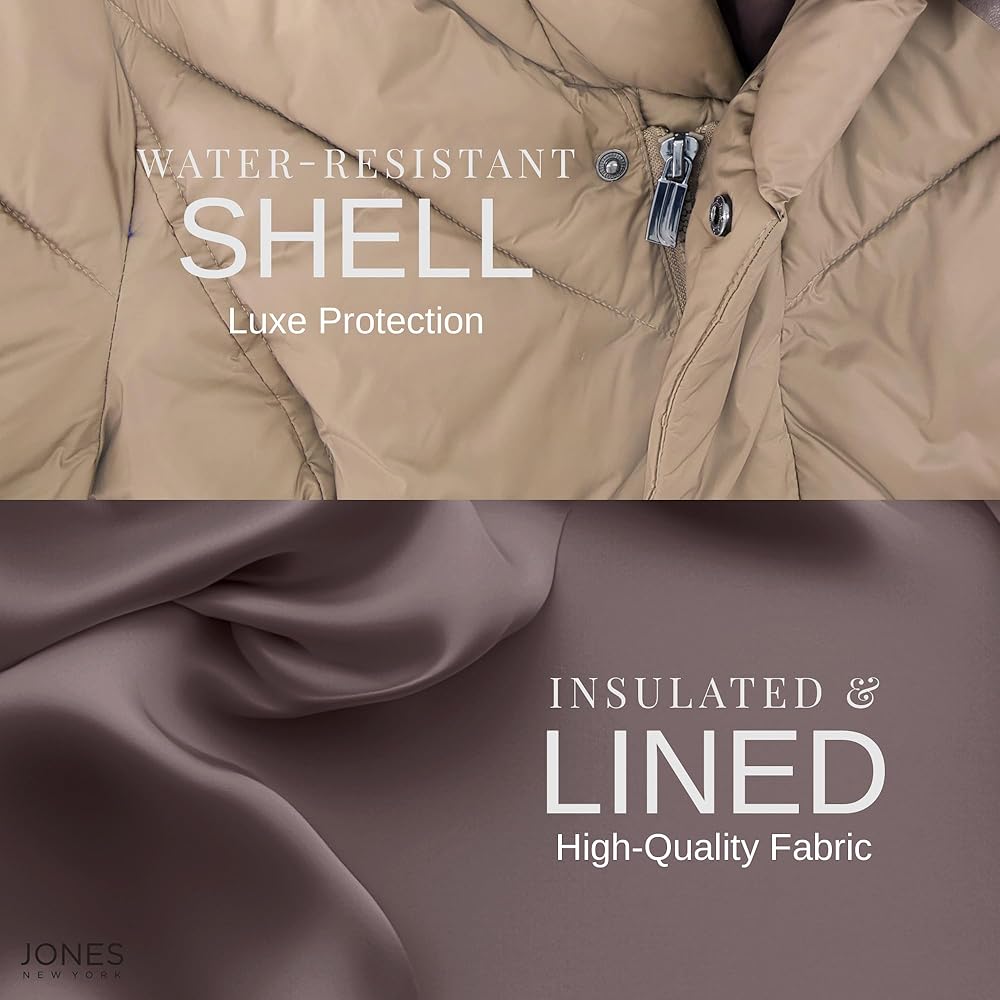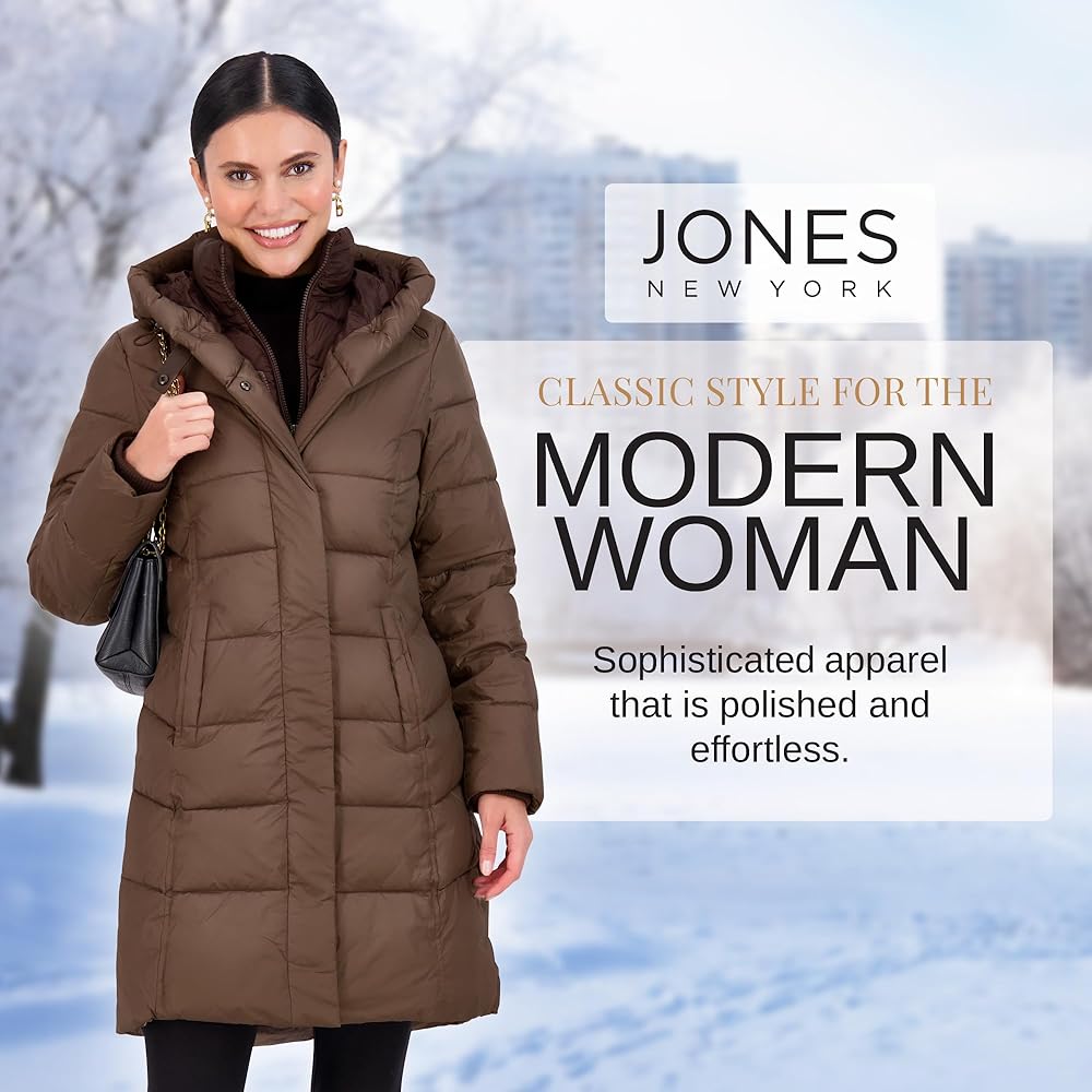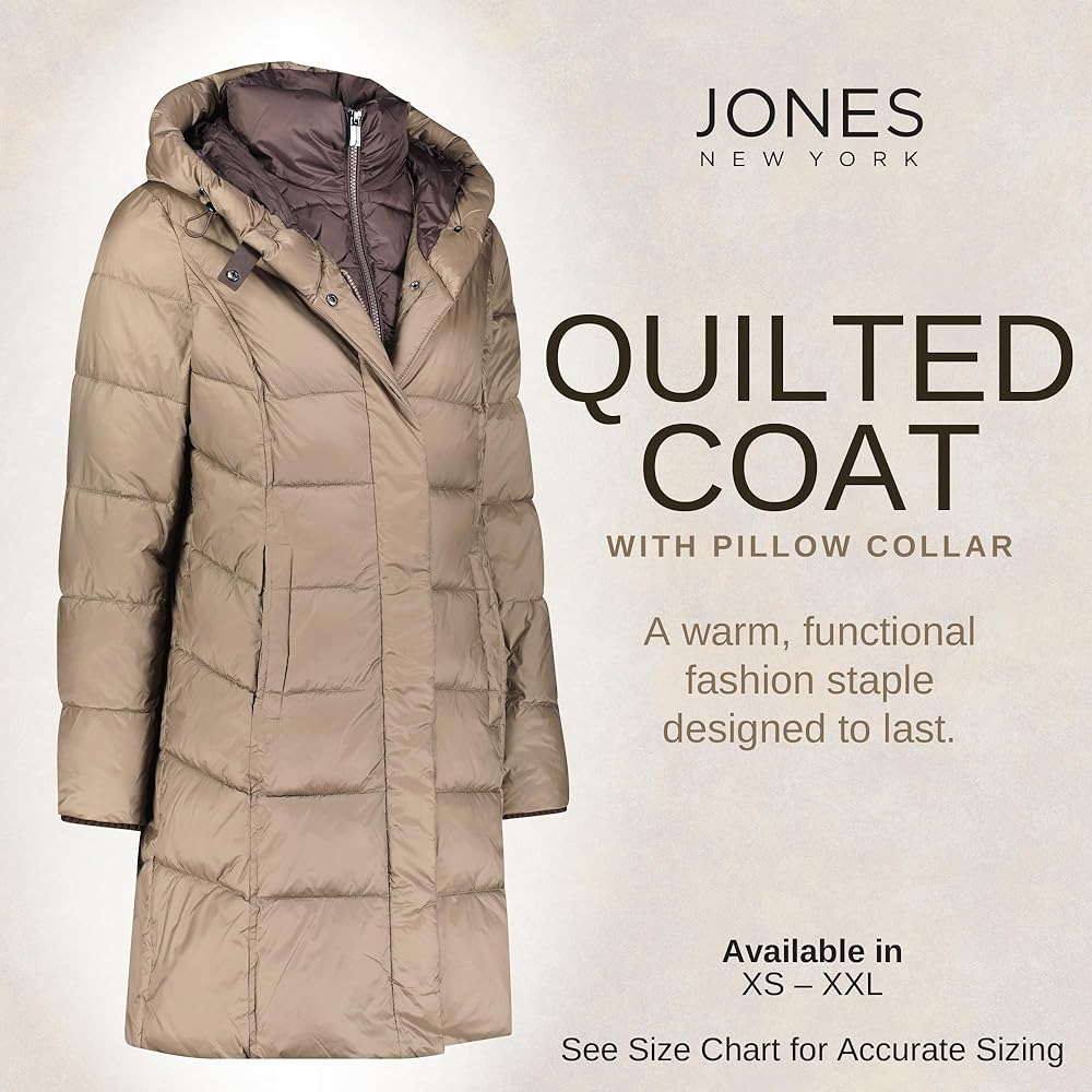 PUFFER COAT WITH BIB & PILLOW COLLAR - A cozy bib and pillow collar top off this cozy womens puffer jacket from Jones New York. Our puffy coats for women are available in Black, Navy, Wine, and Bronze, and Sizes XXS, XS, S, M, L, XL, XXL.