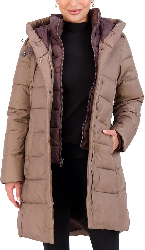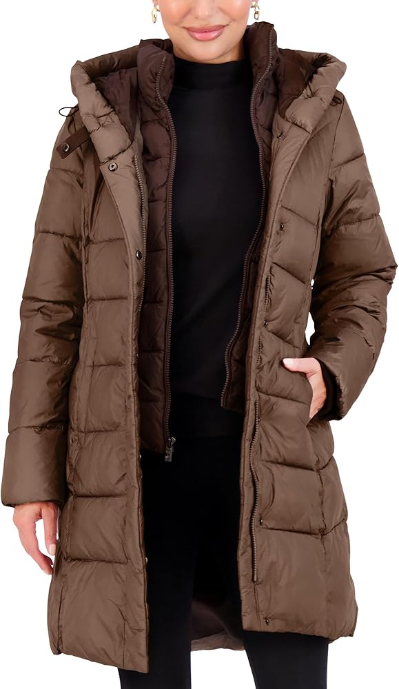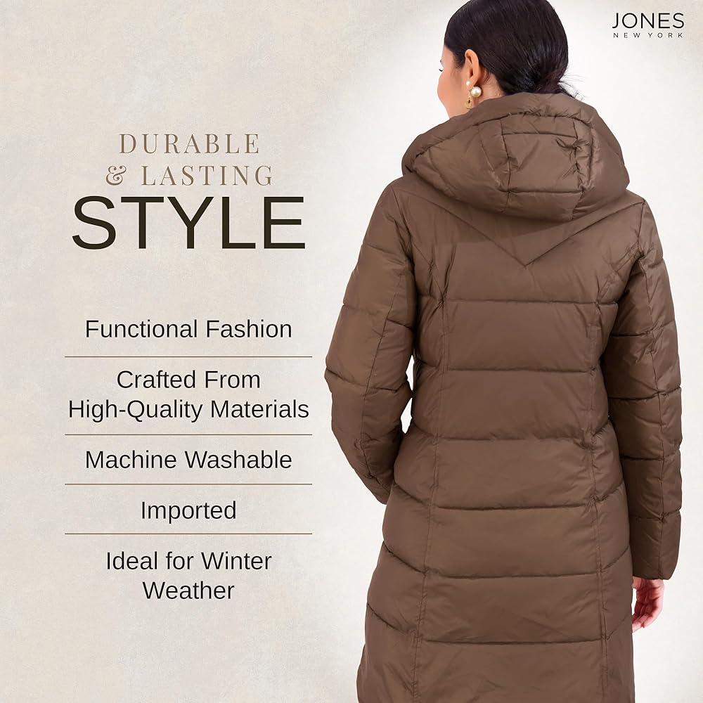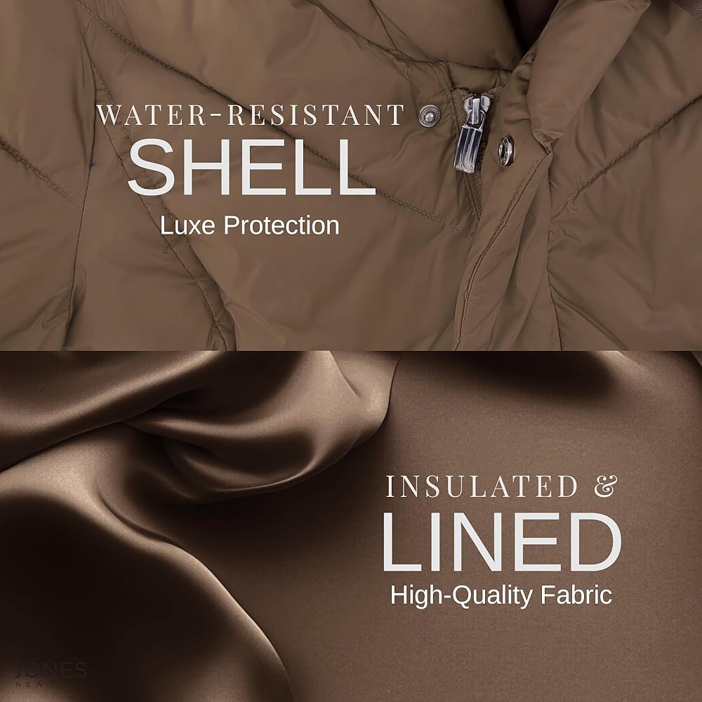 PUFFER COAT WITH BIB & PILLOW COLLAR - A cozy bib and pillow collar top off this cozy womens puffer jacket from Jones New York. Our puffy coats for women are available in Black, Navy, Wine, and Bronze, and Sizes XXS, XS, S, M, L, XL, XXL.